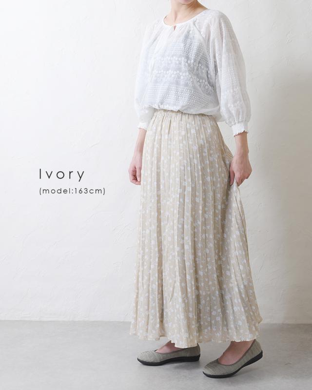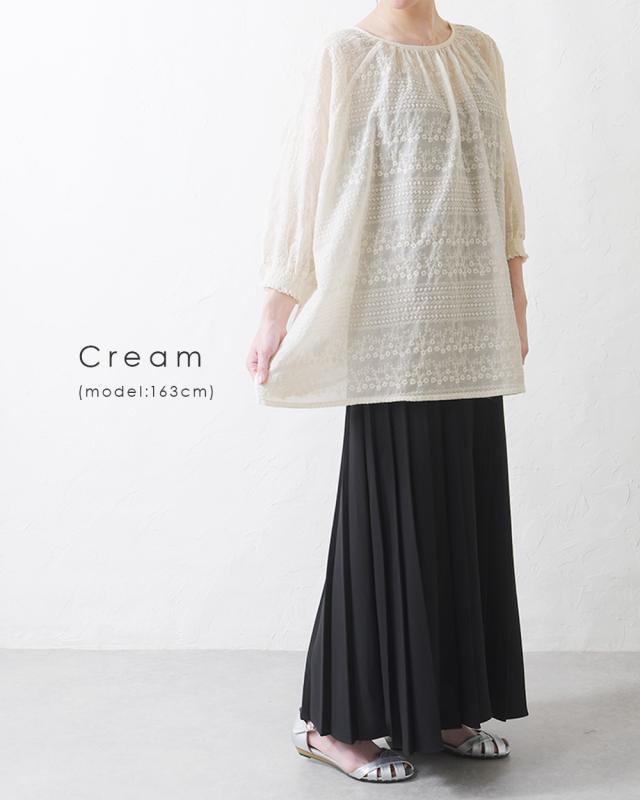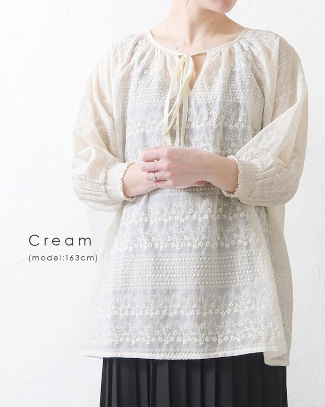 ギャザーがたっぷり入ったシルエットと総刺?が可愛らしいブラウスです。