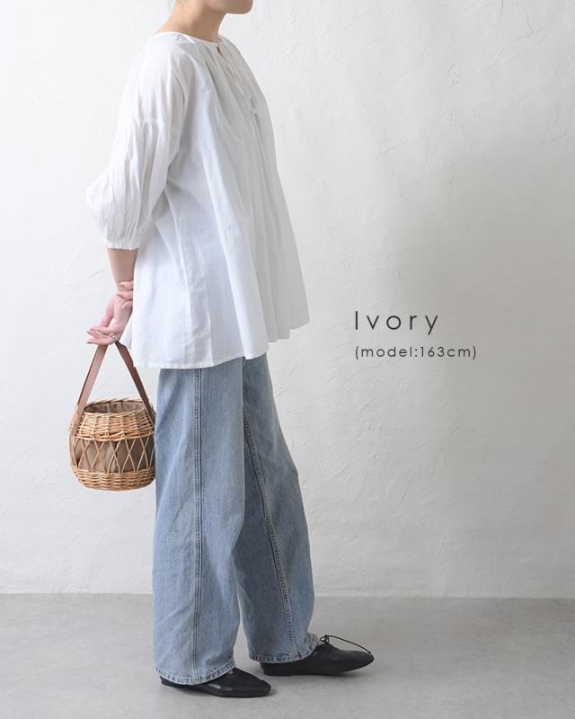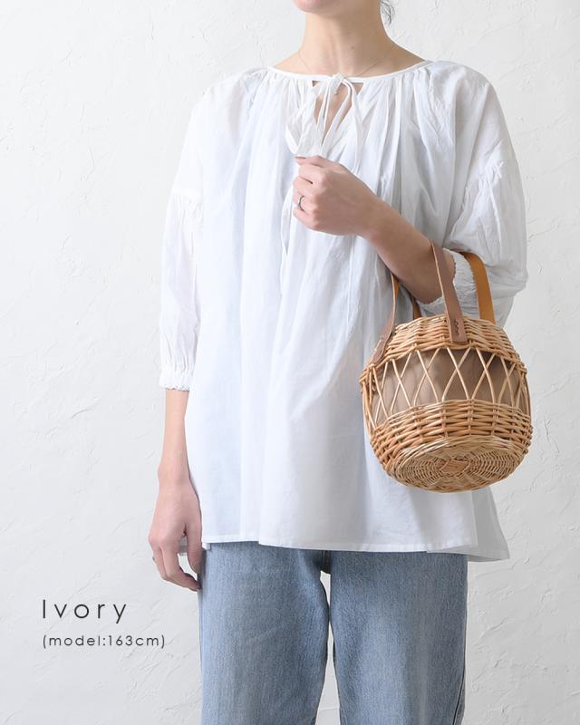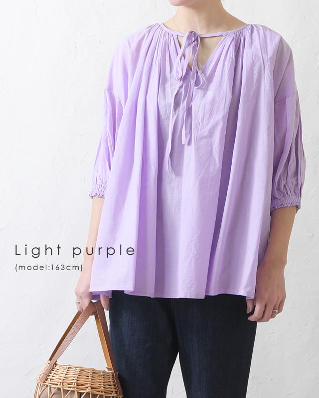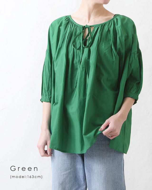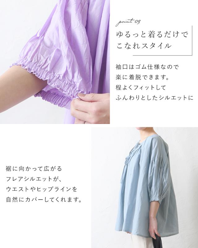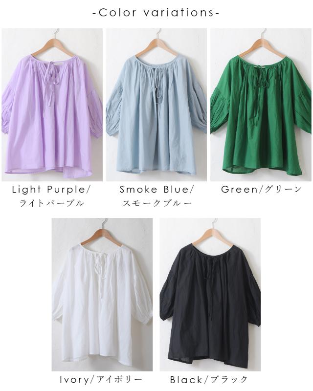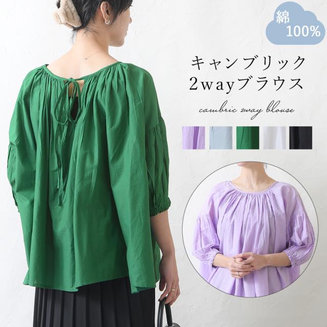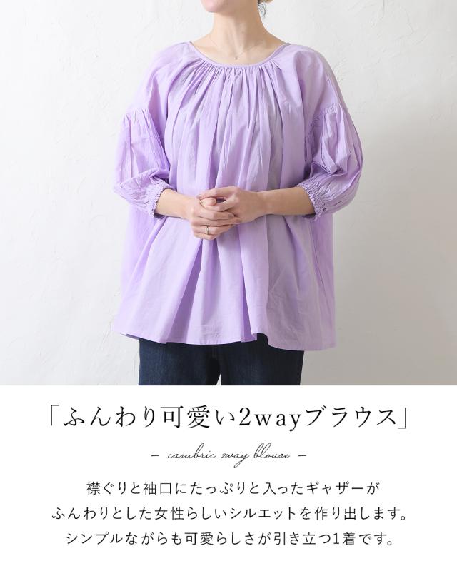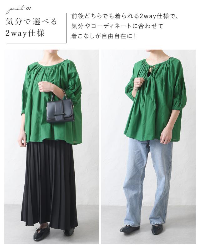 【メール便可】ブラウス レディース トップス 五分袖 袖口 ギャザー シャーリング ゴム 前後着用 2way 綿 コットン 綿100% コットン100% フェミニン カジュアル オフィス ゆったり 大人可愛い 大人 ナチュラル 無地 おしゃれ 黒 白 春 夏