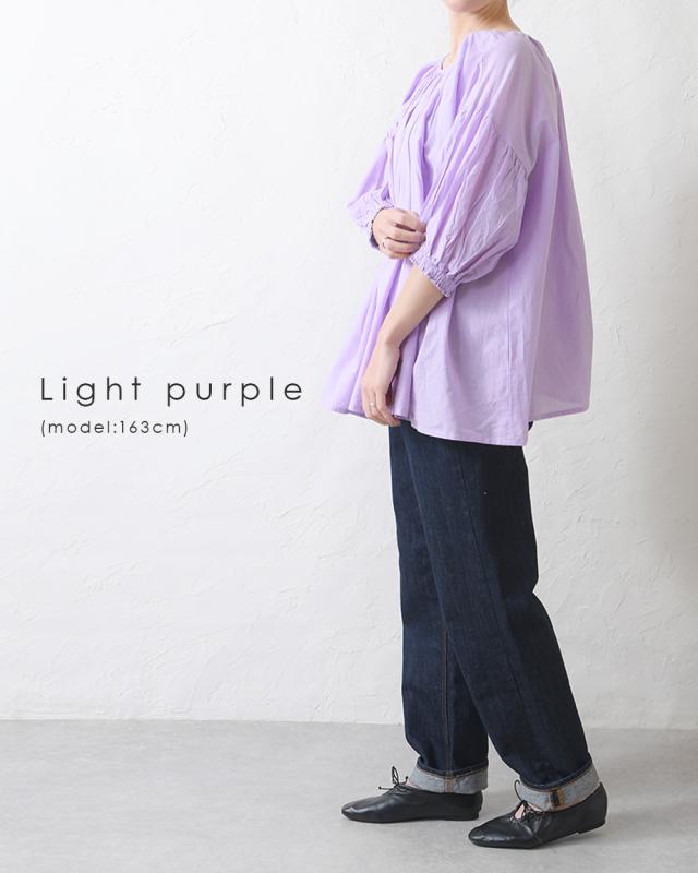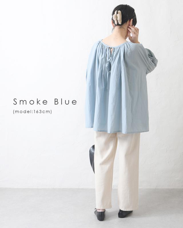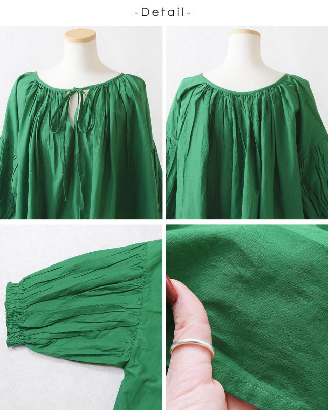 襟ぐりと袖口にたっぷりと入ったギャザーが