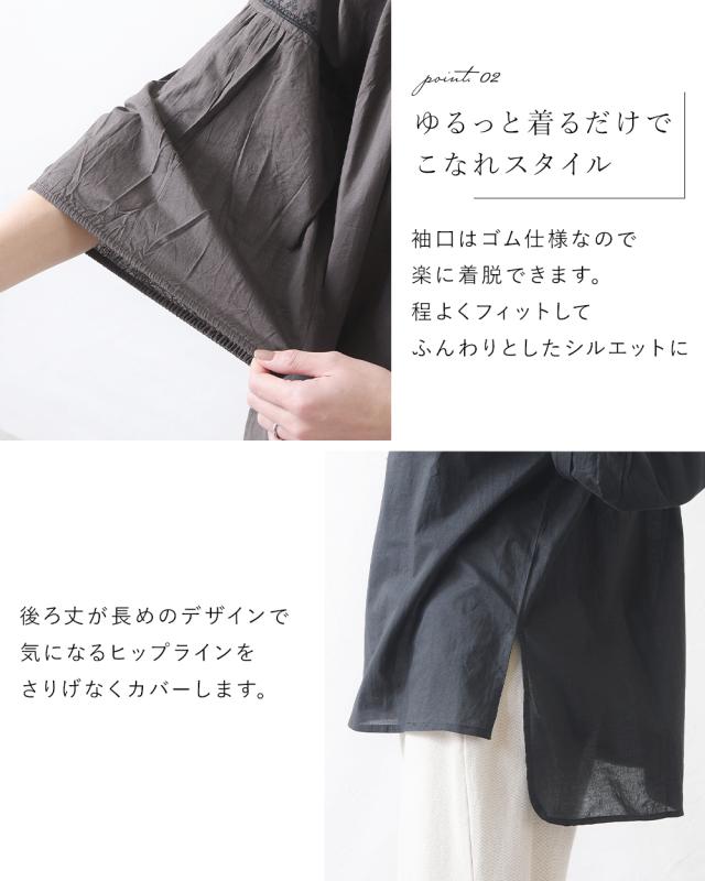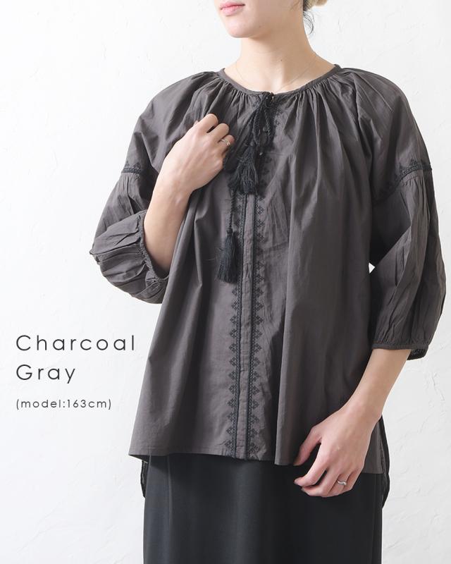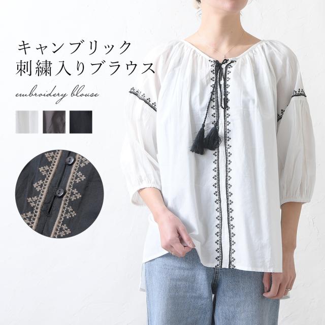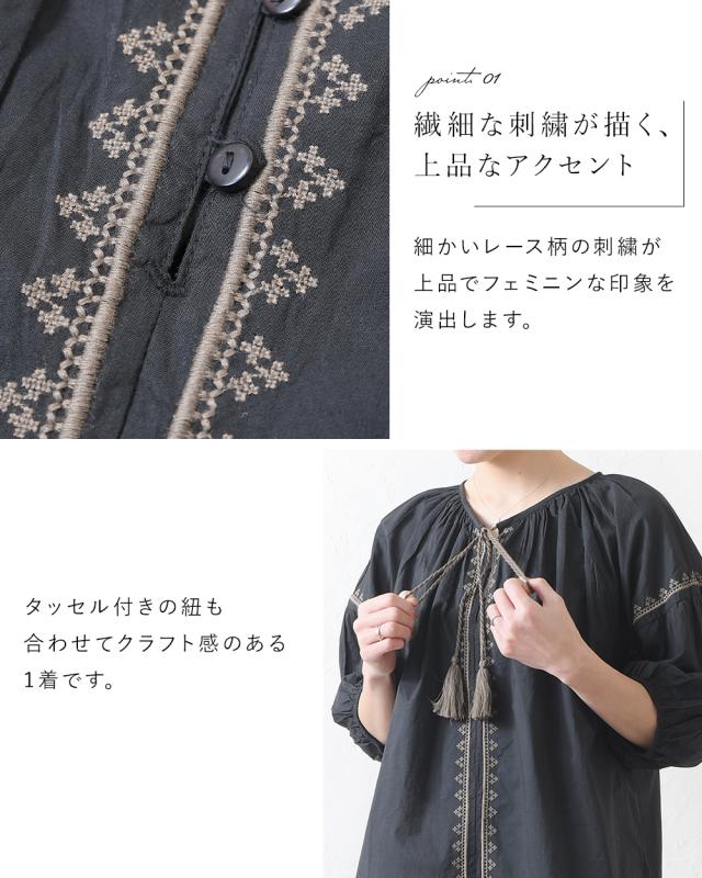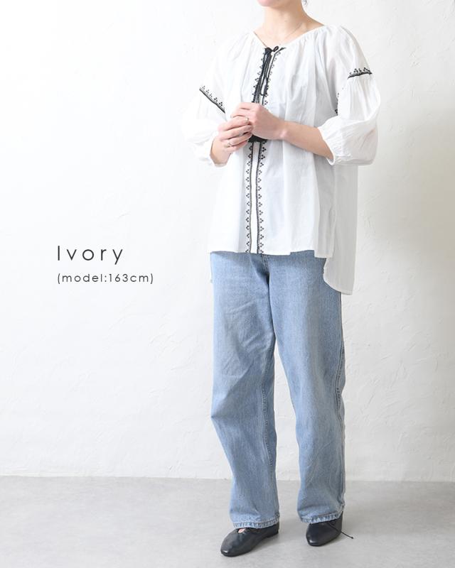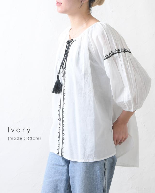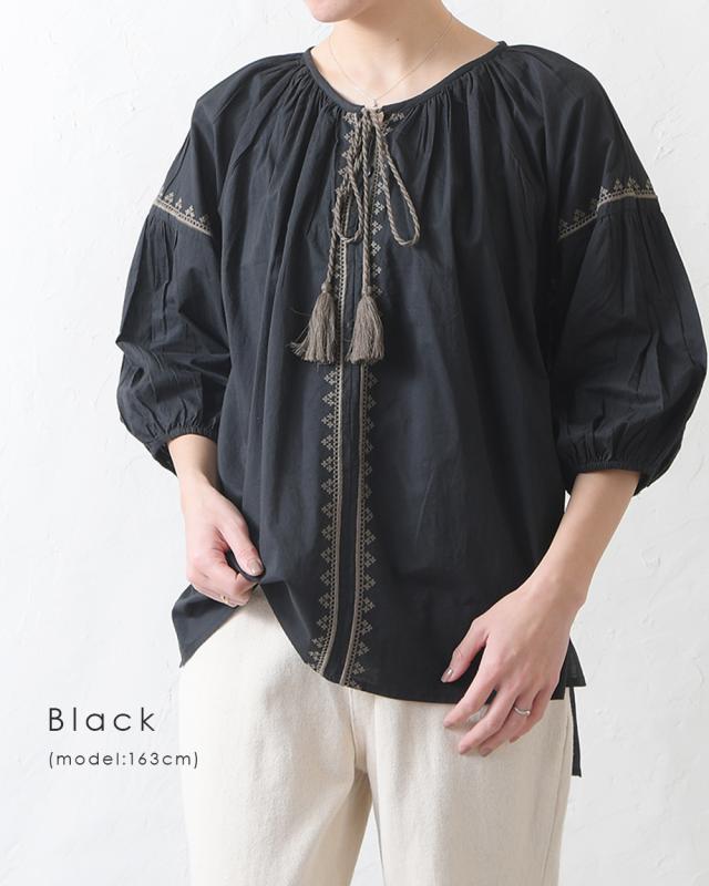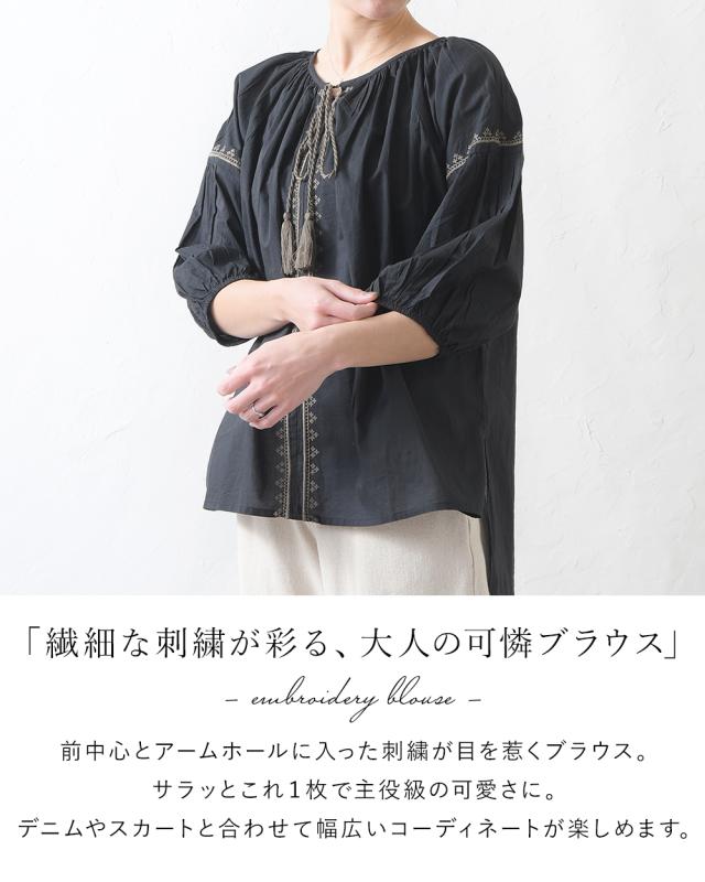 前中心とアームホールに入った刺繍が目を惹くブラウス。