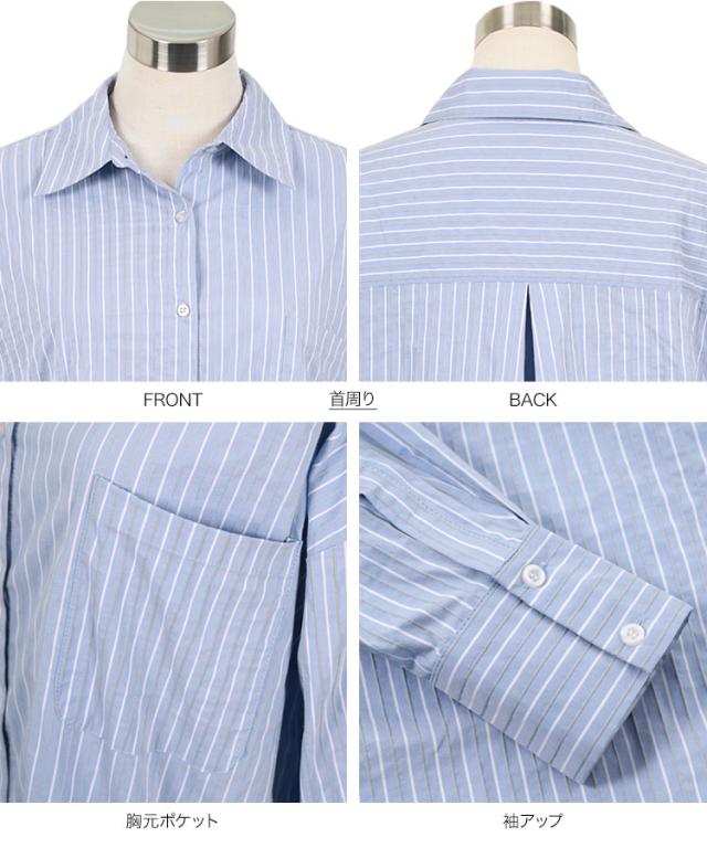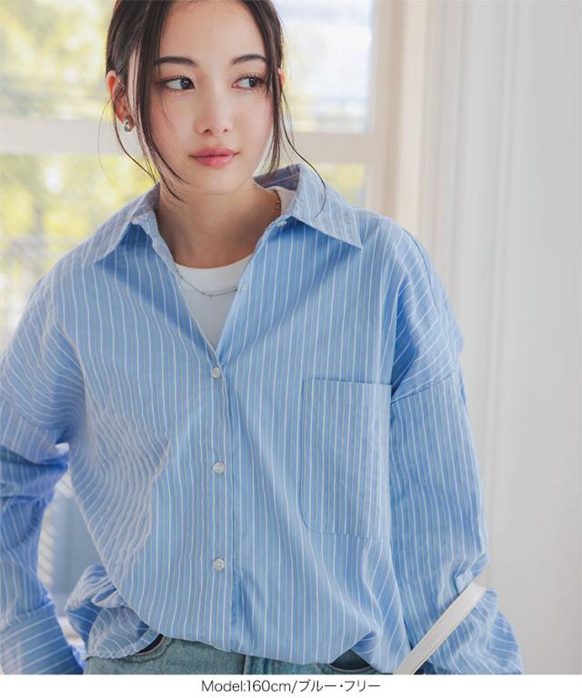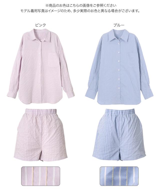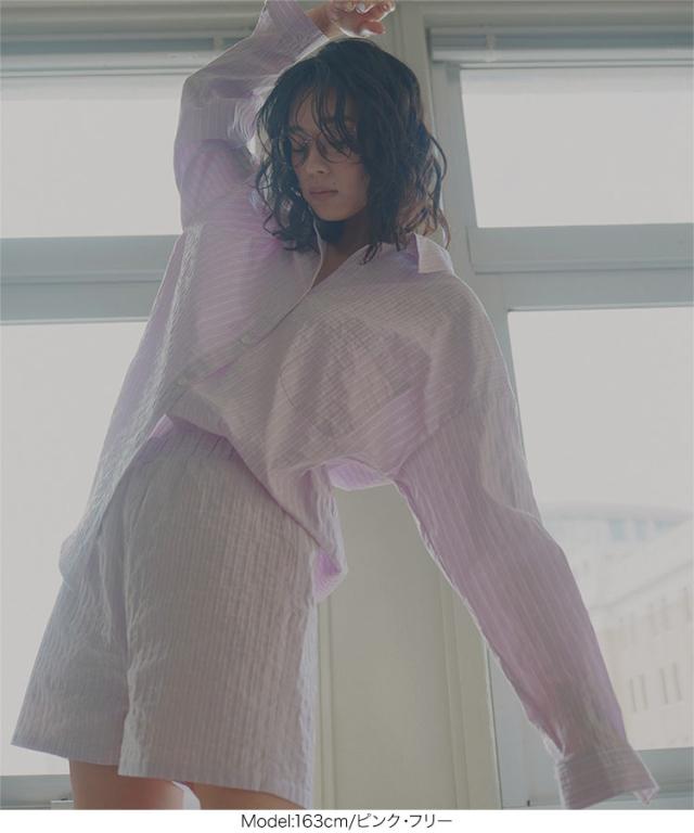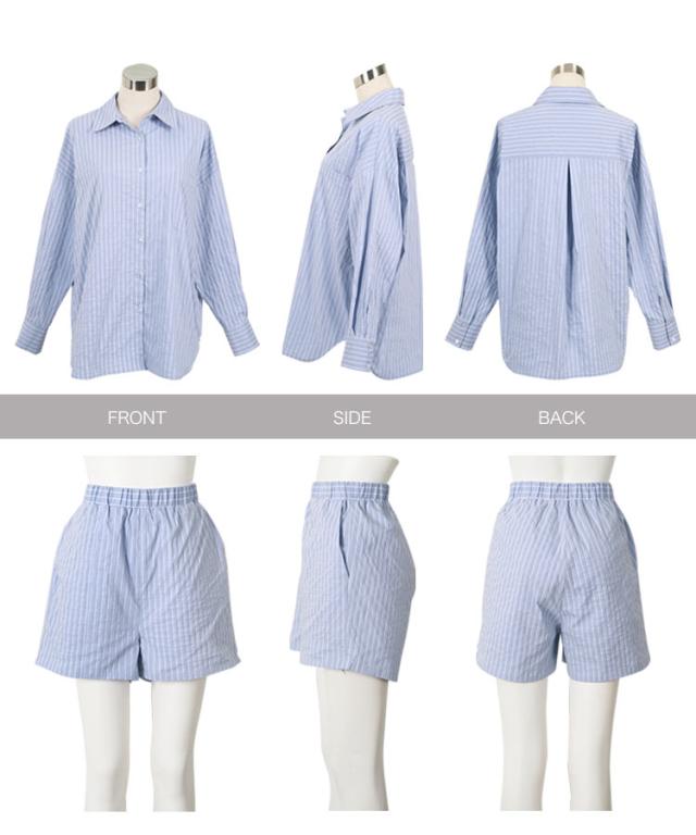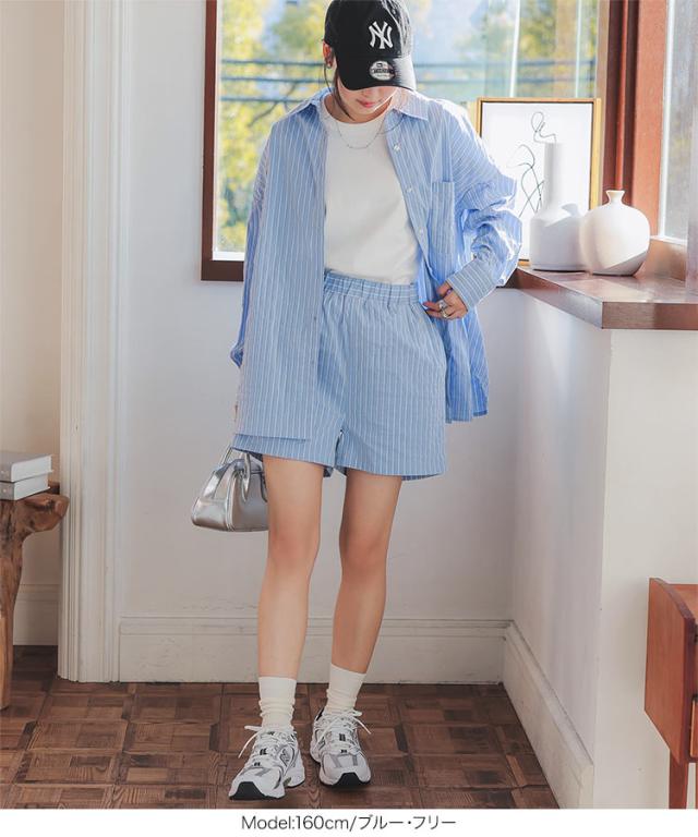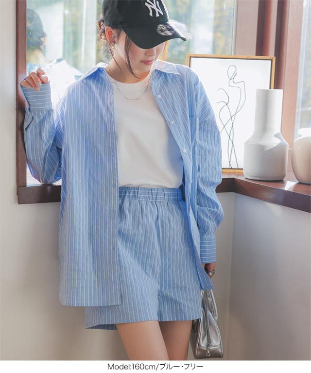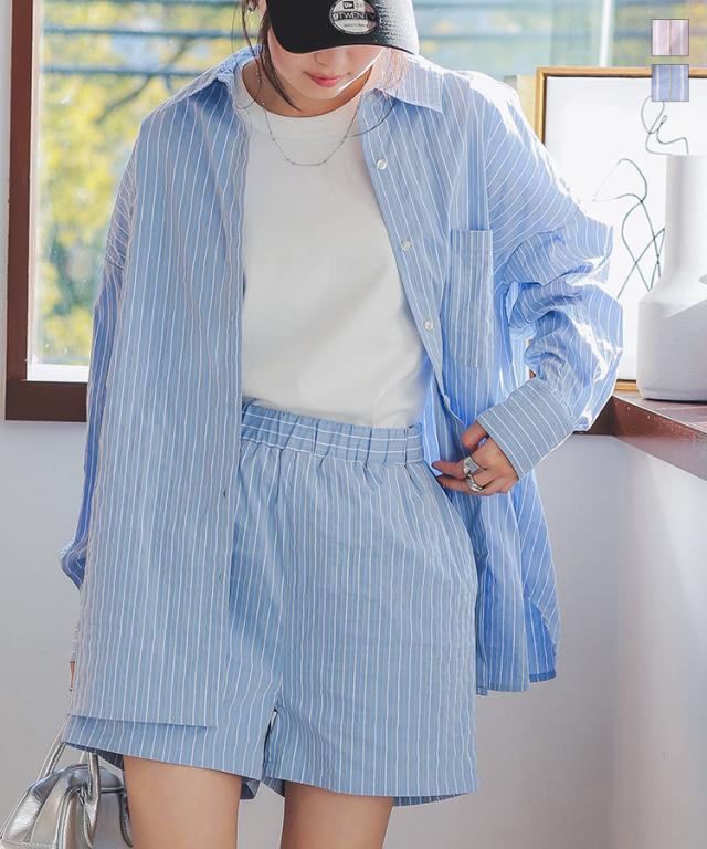 ストライプシャツセットアップ E3474 入荷済 レディース 20代 30代 40代 シャツ 長袖 トップス ショート丈 ボトム パンツ ストライプ ボーダー マルチストライプ オーバー ゆったり ポケット ボタン カフス 裏地 ショーパン ショ