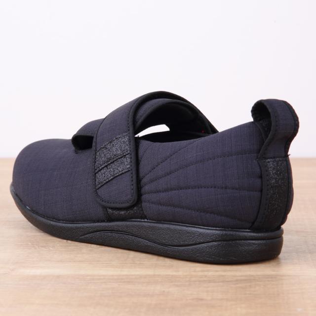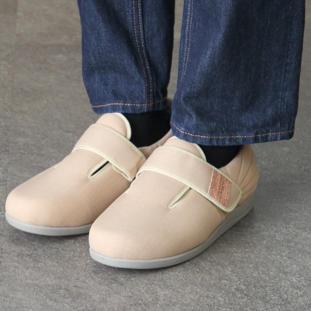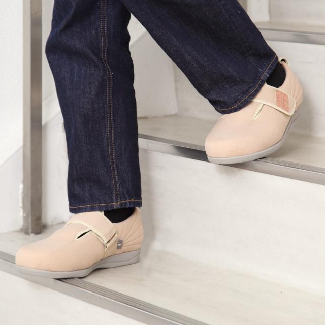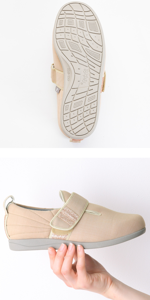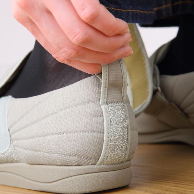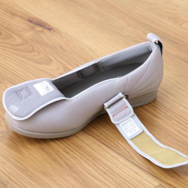 内素材がやわらかくベルトが甲全体に優しくフィットするので、むくみや腫れがあるときも、足の状態に合わせてベルトで調整できます。外反母趾の方や足ゆびに変形・痛みがある方、甲高の方にもおすすめです。ベルトは面ファスナーの調整によって+2cmまで延長できます。