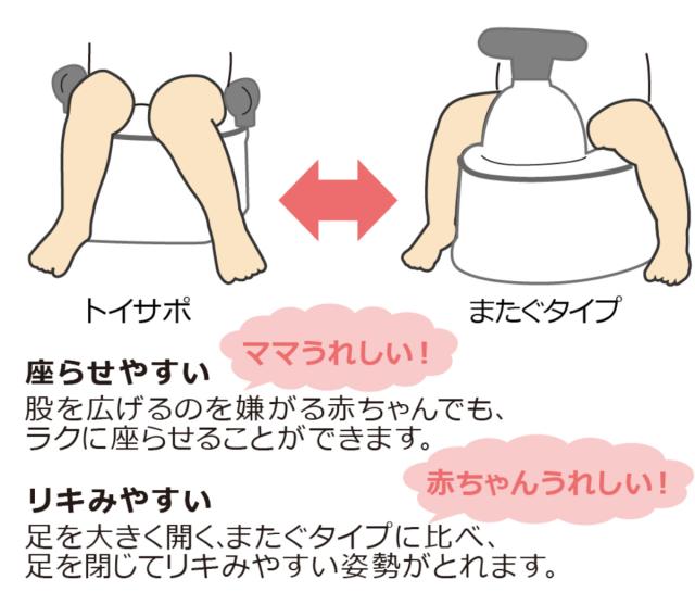 イス型なのでパンツを全部脱がさずに、サッと座らせる事ができます。足を閉じて座る姿勢で、大人用トイレに早く慣れることができます。