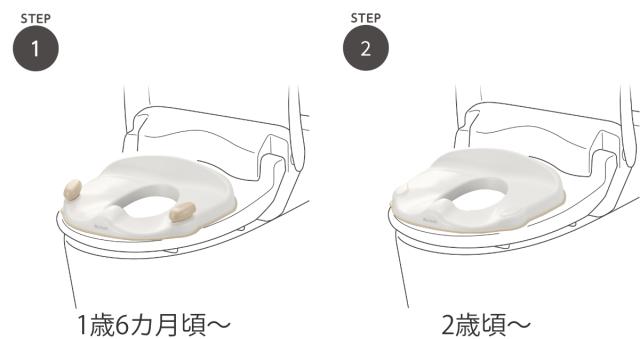 お子様の成長に合わせて、グリップあり補助便座、グリップなし補助便座とステップアップできます。