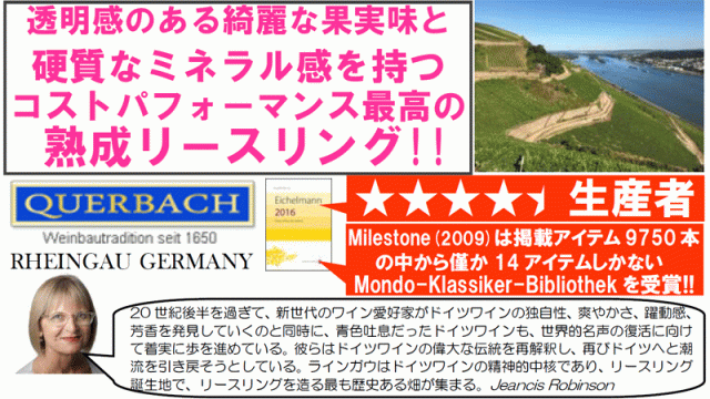 クヴェアバッハは、「驚くほどフレッシュな酸と綺麗なミネラルが持続する熟成したリースリングの魅力をもっと伝えたい」という言葉通り、驚くべきコストパフォーマンスで熟成リースリングを供給。入念な畑仕事と醸造により評価誌アイヒェルマンで4.5ツ星を獲得している。