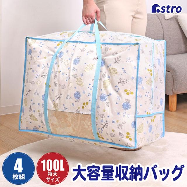 収納ケース 収納袋 収納バッグ 北欧柄 不織布 引越しバッグ 4枚組 100L 布団 衣類 収納 持ち手 透明窓 アストロ 606-05