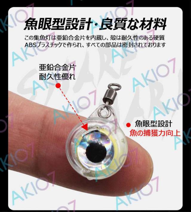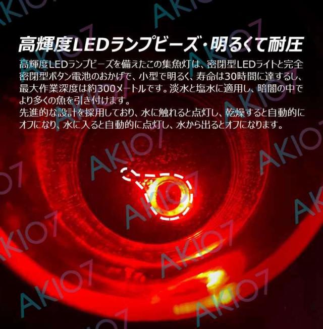 高輝度LEDランプビーズを備えたこの集魚灯は、密閉型LEDライトと完全密閉型ボタン電池のおかげで、小型で明るく、寿命は30時間に達するし、最大作業深度は約300メートルです。淡水と塩水に適用し、暗闇の中でより多くの魚を引き付けます。
