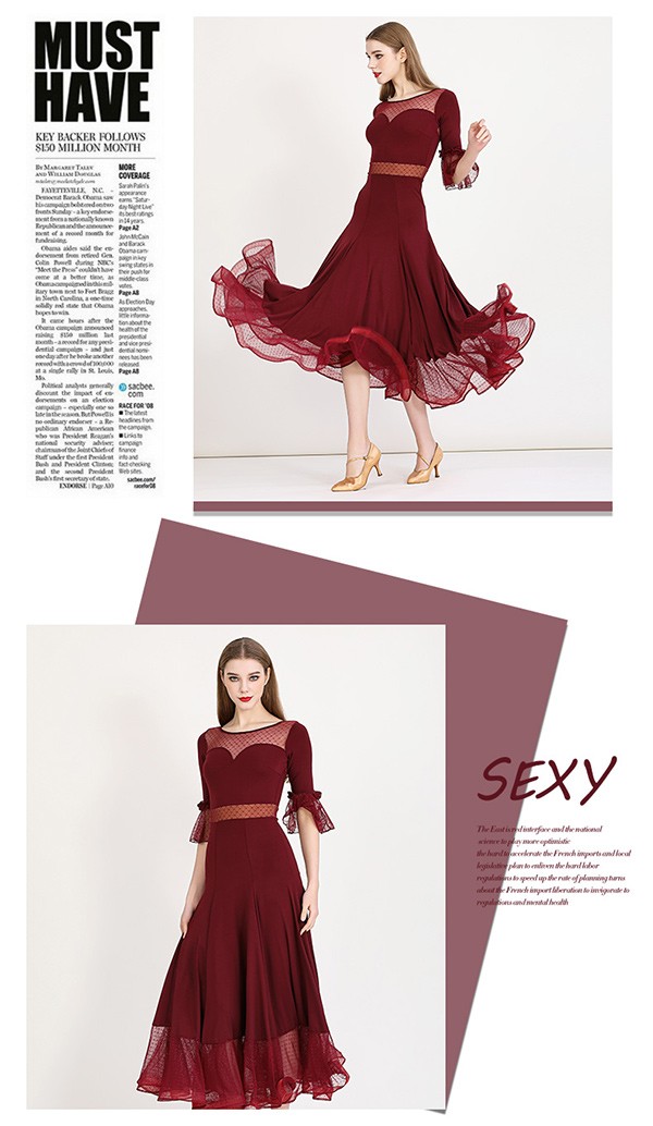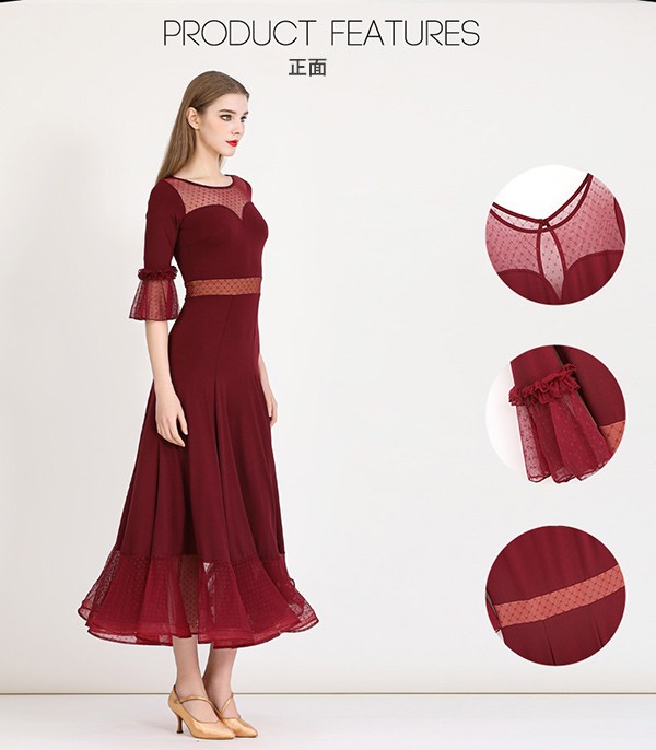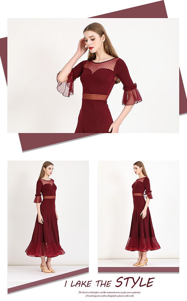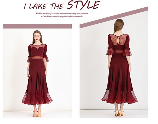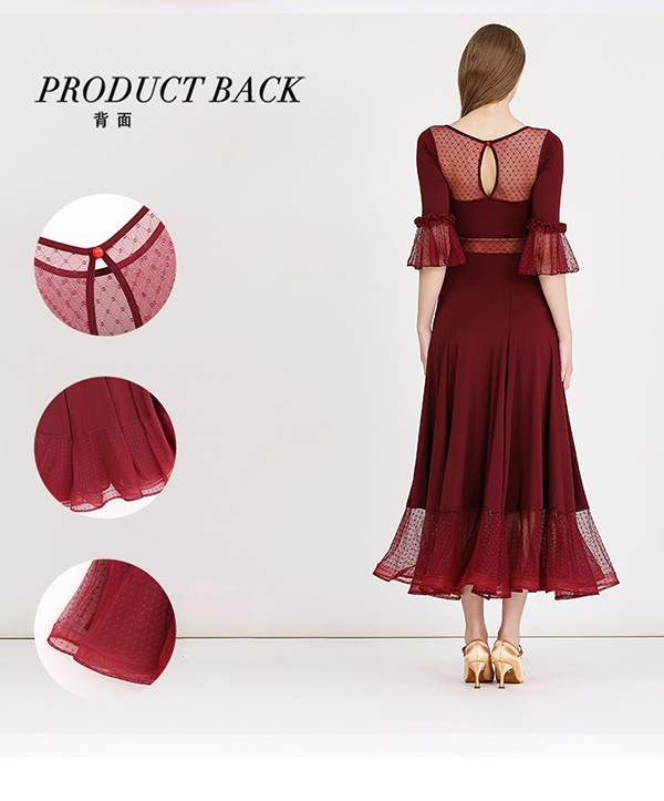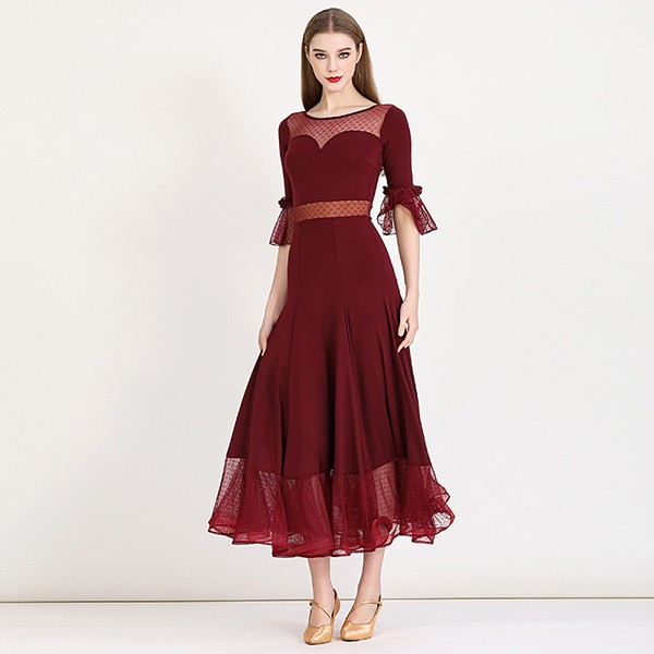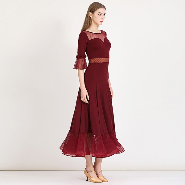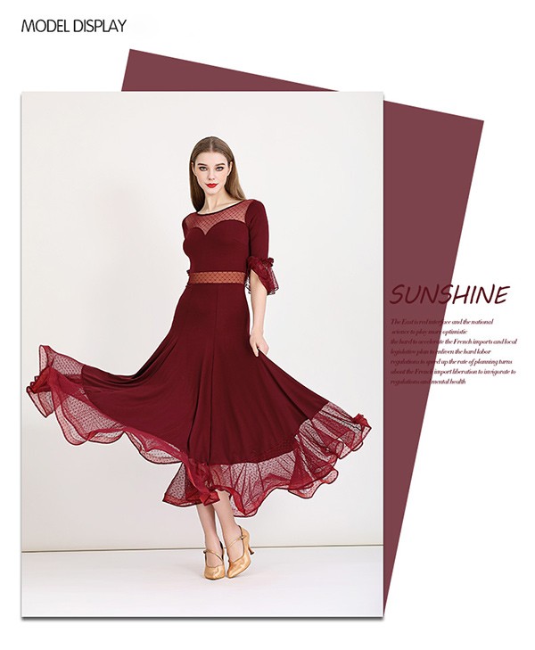 社交ダンス ドレス ロングドレス フリル 半袖 モダンドレス 社交ダンス衣装 モダン スタンダード ワルツ ワンピース 無地 ダンス衣装 ステージ衣装 パーティー 発表会 競技用 コンクール 練習着 レッスン 舞台用 演奏会 ワインレッド ブラック 黒 dm023m5