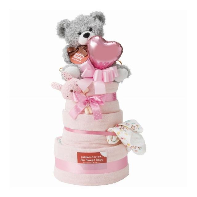 紙おむつを丸めて、リボンやお花などで可愛く飾りつけをし、デコレーションケーキに見たててプレゼント。可愛くて開けてびっくり、感動を呼ぶサプライズ。HAPPYBABYのカード付き。
