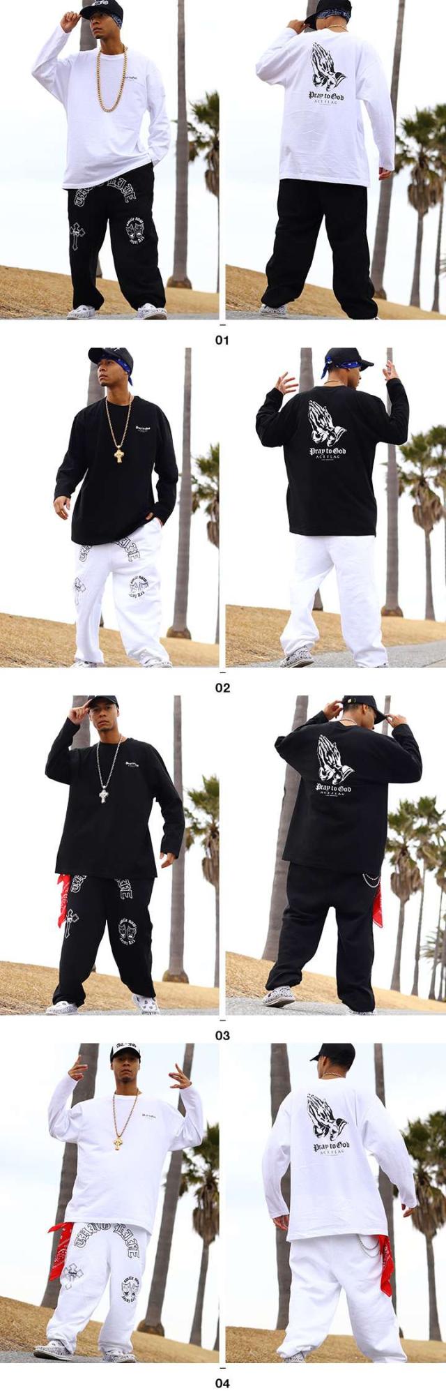 神に祈りを捧げる「Praying Hands/祈り手」をドロップしたロンTと西海岸を代表するラップスターのタトゥーをドロップしたスウェットロングパンツの上下セット。