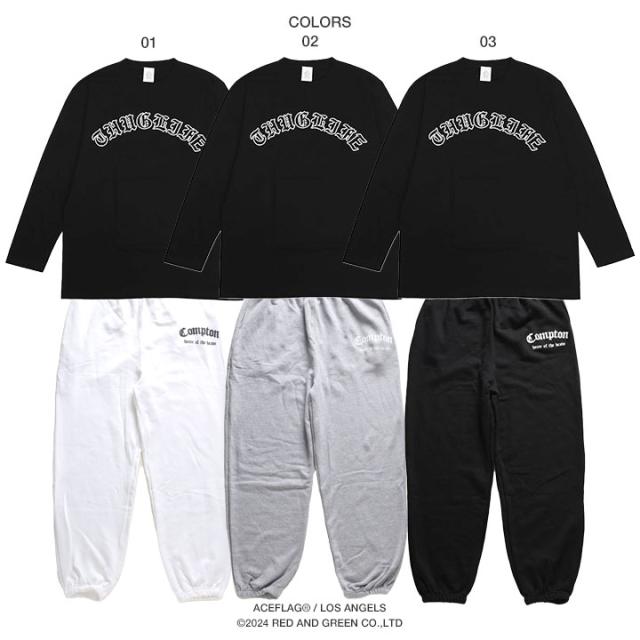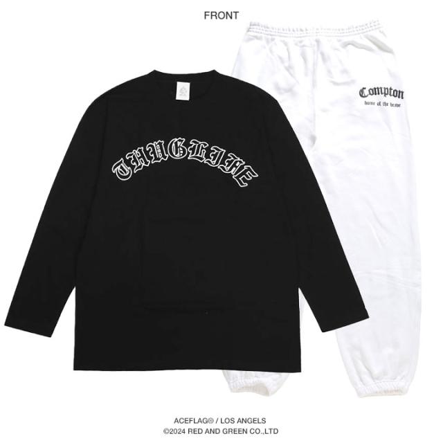 伝統的なオールド文字の「Thug Life」をドロップしたロンTと「Compton」をドロップしたスウェットロングパンツの上下セット。