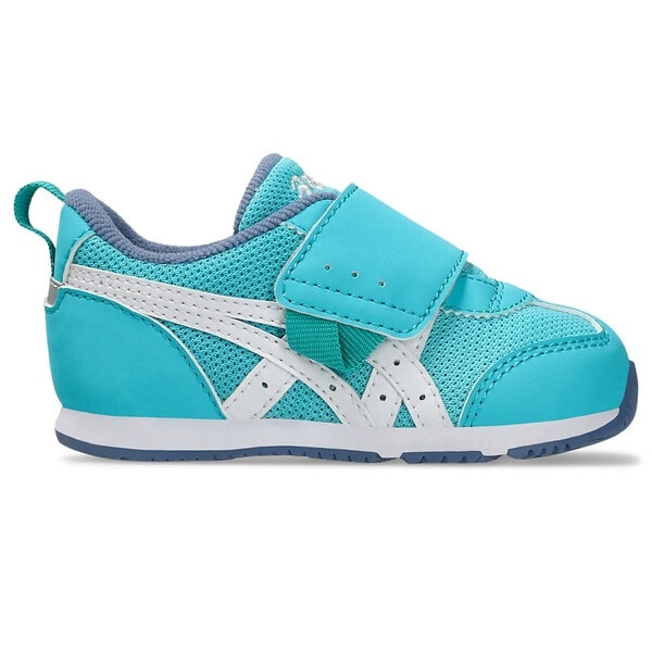 約1歳から3歳の幼児向けに展開する「BABY」シリーズのローカットシューズ。扇形のつま先部分は足ゆびをのびのびと動かすことができ、踏ん張りやすいのが特徴です。アウターソールは、足の屈曲位置に合わせて溝を配置した「フレックスグルーヴ」を採用。足の動きにしなやかに追従します。かかとの安定性を重視し、かかとを包み込む立体的なインナーソールを使用しています。インナーソールの表面材には抗菌・消臭効果のあるシャインアップと、汗をすばやく吸収・拡散してドライ感を保つウォーターマジックを採用。靴の中を快適に保ちます。甲の内側を1枚の布で包み込むような構造のキモノフィットタンにより、フィット感を高め、アーチ部の倒れ込みを抑えます。アッパーは通気性に優れたラッセルメッシュを使用。街灯や車のライトなどの光を反射する再帰反射材(リフレクター)をかかと部に配置しています。