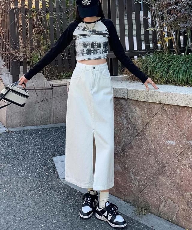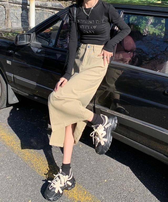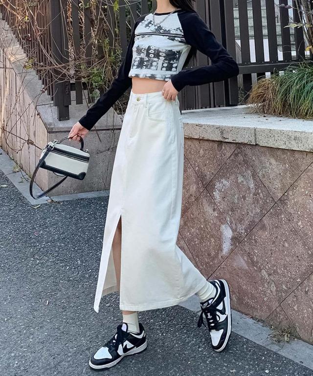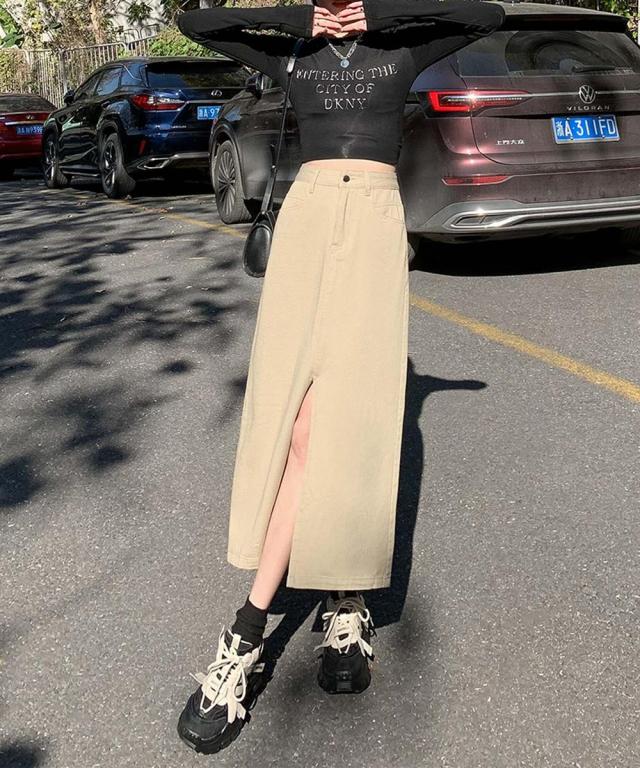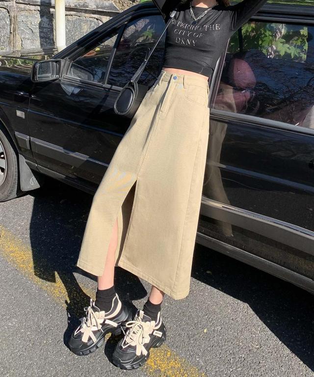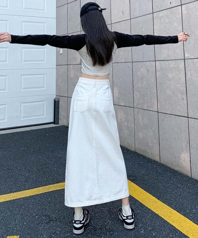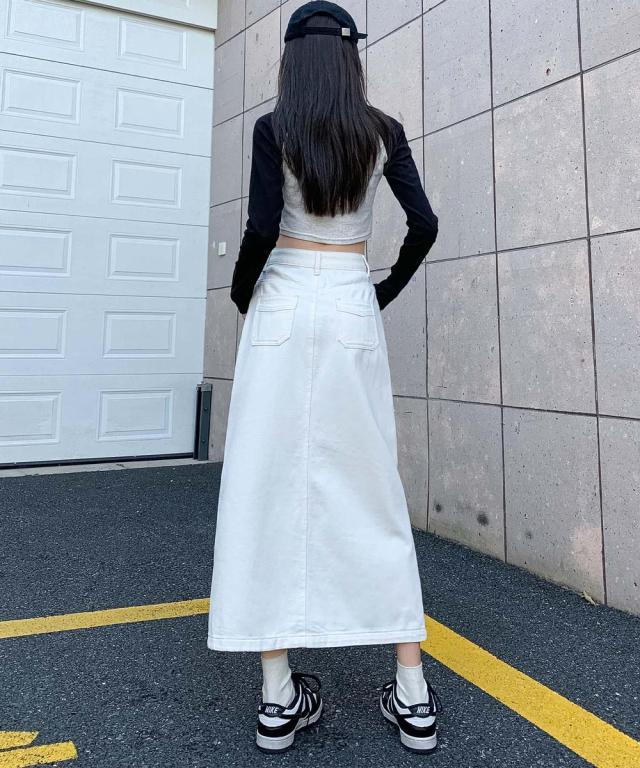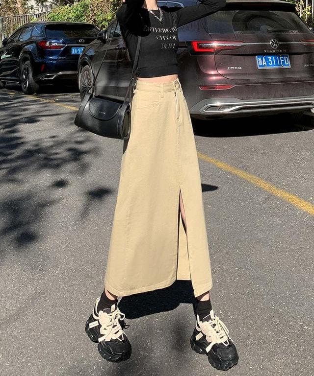 歩くたびに脚のラインがチラッと見えるフロントスリットが大人な印象のデニムスカート。ハイウエストデザインが脚のラインを長く見せ、スタイルアップ効果抜群◎