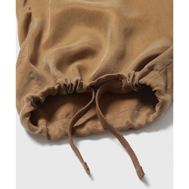 裾はヒモを通して絞って調整する仕様にしており、裾を引きずらず、ブラウジングしたシルエットを楽しんでいただけるディテールにしております。