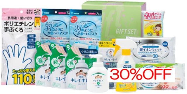 商品内容:内容/ライオンキレイキレイ薬用液体ハンドソープ[日本製]:250ml×1・ライオンキレイキレイ薬用液体ハンドソープ詰め替え用[日本製]:200ml×3・ライオンキレイキレイ薬用手指の消毒ジェル携帯用[日本製]:28ml×1・フマキラーアルコール除菌どこでもクリーナー[日本製]:300ml×1・国産不織布マスク[日本製]:7枚入×2・クリンクル食卓テーブル用シート[日本製]:30枚入×1・ネットスポンジ[中国製]:1P×1・銀イオンウエット(大判)[日本製]:20枚入×1・ポリエチレン手ぶくろ[中国製]:110枚入×1