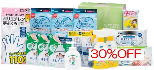 商品内容:内容/ライオンキレイキレイ薬用液体ハンドソープ[日本製]:250ml×1・ライオンキレイキレイ薬用液体ハンドソープ詰め替え用[日本製]:200ml×3・ライオンキレイキレイ薬用手指の消毒ジェル携帯用[日本製]:28ml×2・フマキラーアルコール除菌どこでもクリーナー[日本製]:300ml×2・国産不織布マスク[日本製]:7枚入×3・クリンクル食卓テーブル用シート[日本製]:30枚入×1・ネットスポンジ[中国製]:1P×1・銀イオンウエット(大判)[日本製]:20枚入×1・ポリエチレン手ぶくろ[中国製]:110枚入×1