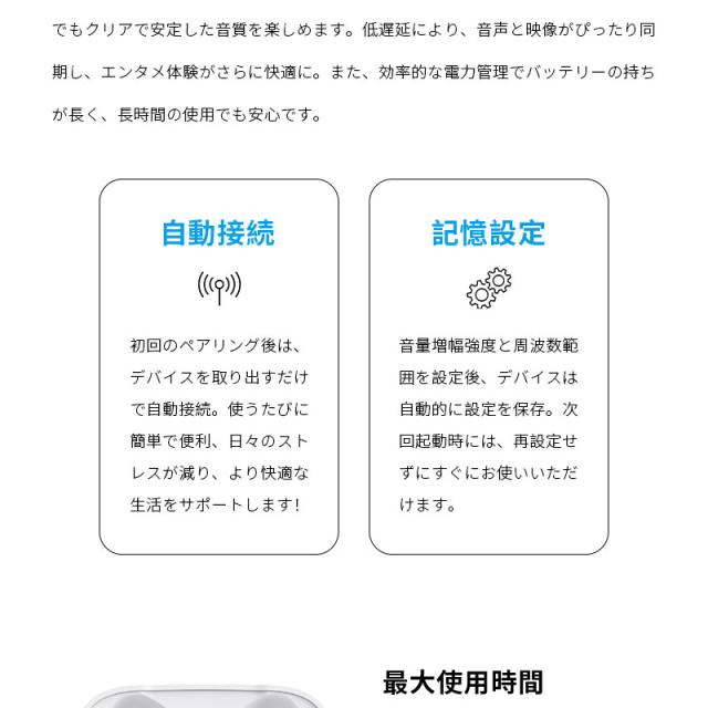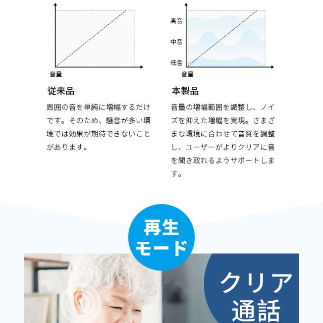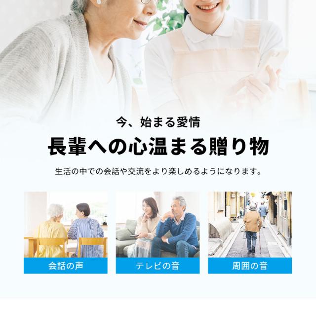 イヤホン型集音器は聴覚障害などがない健聴者を対象としています。 難聴とは診断されないものの聞こえに課題を感じている人や、加齢に伴って耳が遠くなっている人などが主な対象となります。 また、集音器は誰でも使えることを想定して作られています。一方で、補聴器は難聴者を対象としています。イヤホンでありながら、日常生活で聞こえてくる音を大きくするための便利グッズです。