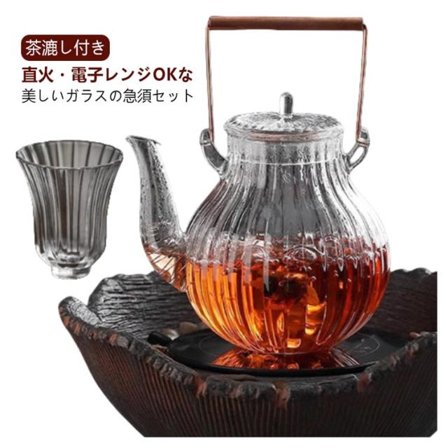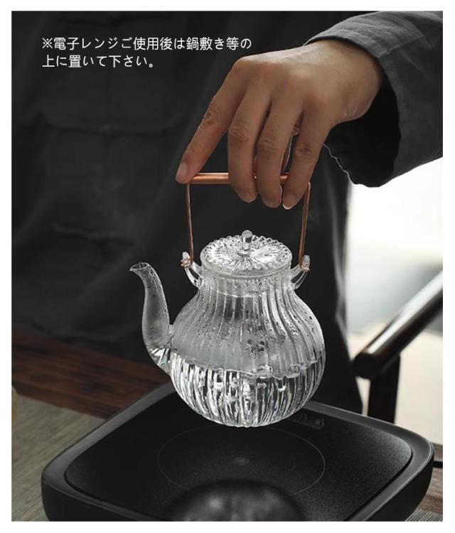 | 茶漉し付き 直火・電子レンジOKな美しいガラスの急須セット (ティーポット*1個+ティーカツプ*6個) ■着脱が簡単なステンレス製金針式茶漉し付き 茶葉の持つ香りと味を十分に引き出す設計 丸型の形状に、茶漉しは注ぎ口に挿入するワイヤー式のため、茶葉がジャンピングしやすくなっています。 ■透明度が高く、ポットの中の様子が見えるため、緑茶、紅茶、ハーブティー、お花のお茶、フルーツティー…などなど、いろんなお茶を見て愉しむこともできます。 また、把手は銅製なので使い込んでいくと味わい深く変化していきます。 400度まで耐えることができますが、弱火をおススメ。ただし耐熱温度以下であっても、温度差が大きい場合には割れが発生する可能性もありますので、注意が必要です 食器洗浄※・乾燥機OK 耐熱ガラスなのでキャンドルウォーマーや電子レンジで使えます。 本体のみ電子レンジ使用可 電子レンジでのご使用の注意 ※電子レンジで使用する際は茶こしを外して下さい。 ※空の状態で使用しないで下さい。 ※突然一気に煮沸して激しく吹き出す恐れがあります。 ※電子レンジから本体を取り出す際は鍋つかみ等を使用し、顔などを近づけないで下さい。 ※電子レンジご使用後は鍋敷き等の上に置いて下さい。 ※電子レンジをご使用前は、本体の水滴を拭き取って下さい。 | |