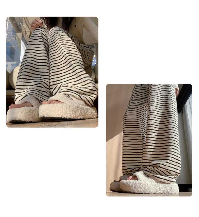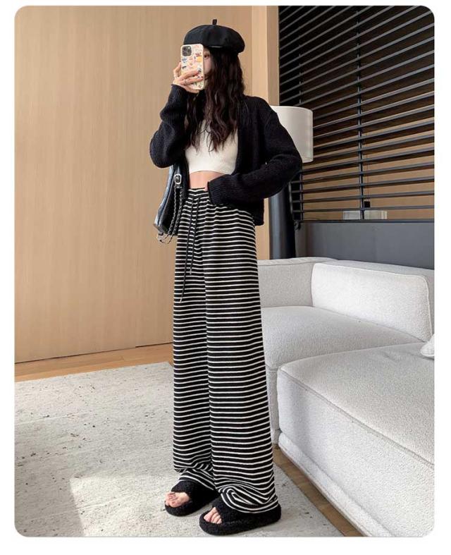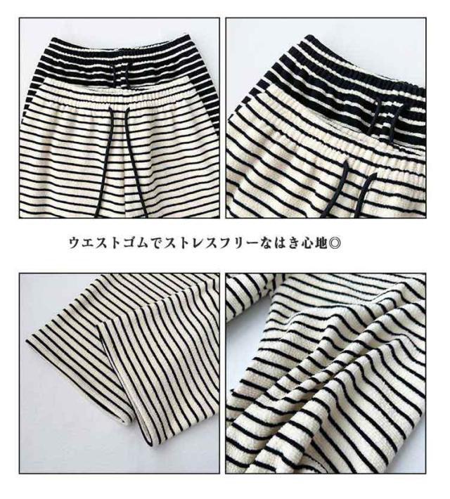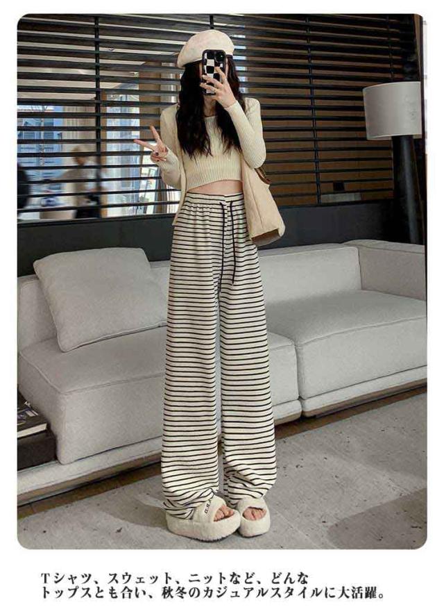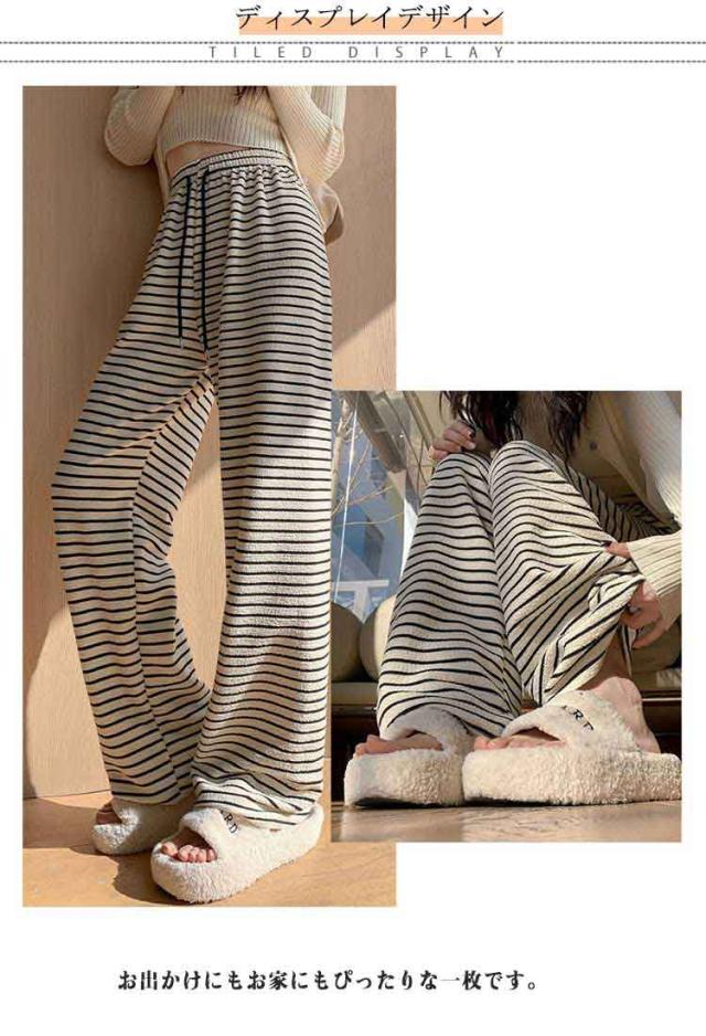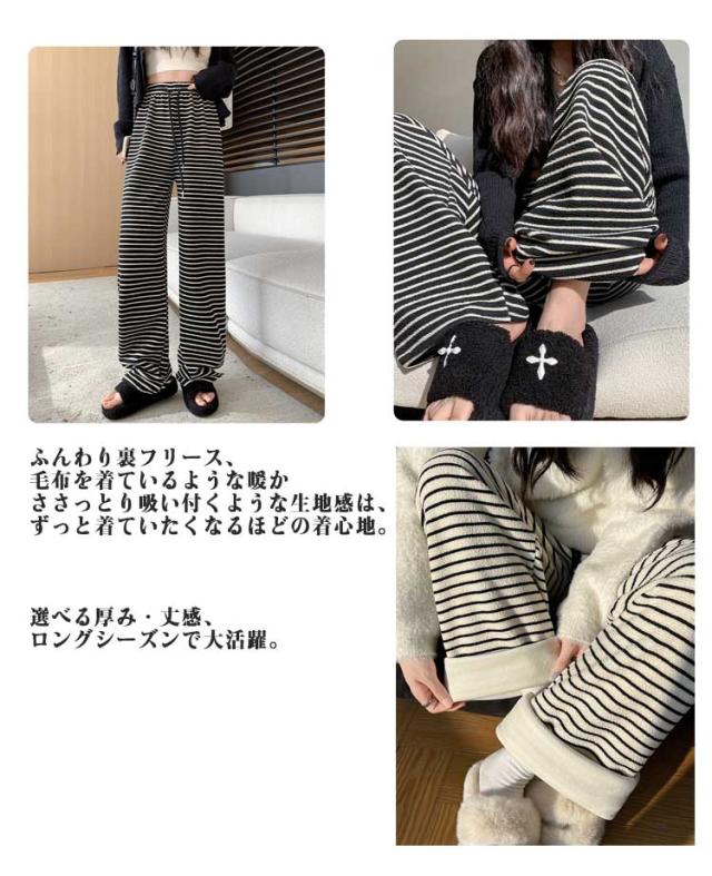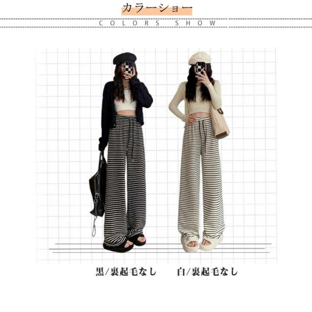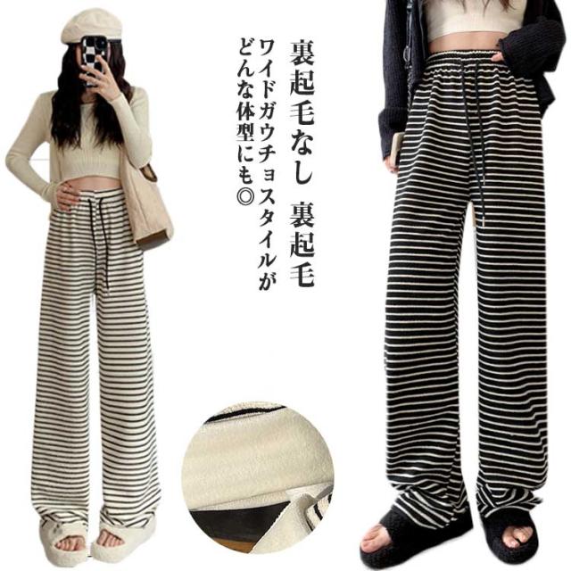 ワイドパンツ ボーダー柄 ストレートパンツ レディース ロングパンツ ワイド ルームパンツ 裏起毛なし 裏起毛 ウエストゴム ストレート 美シルエット ゆったり カジュアル きれいめ 美脚 着痩せ 可愛い 体型カバー ロングパンツ ブラック ホワイト 暖かい 送料無料
