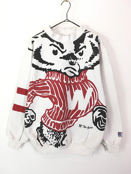 古着 90s Canada製 Wisconsin バッキー 両面 特大 プリント モックネック スウェット トレーナー M 古着