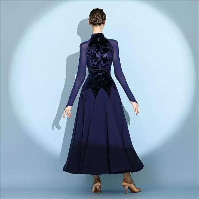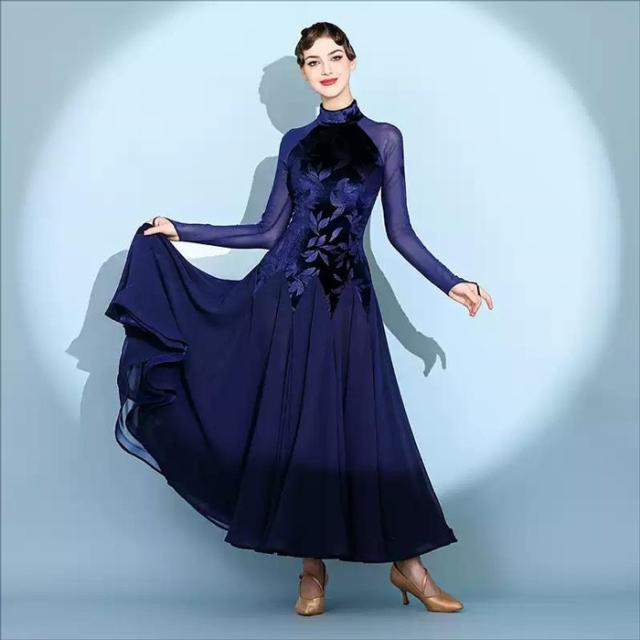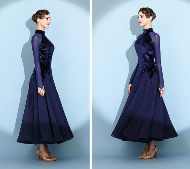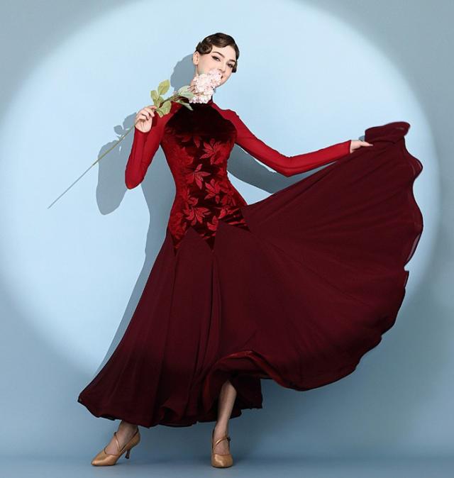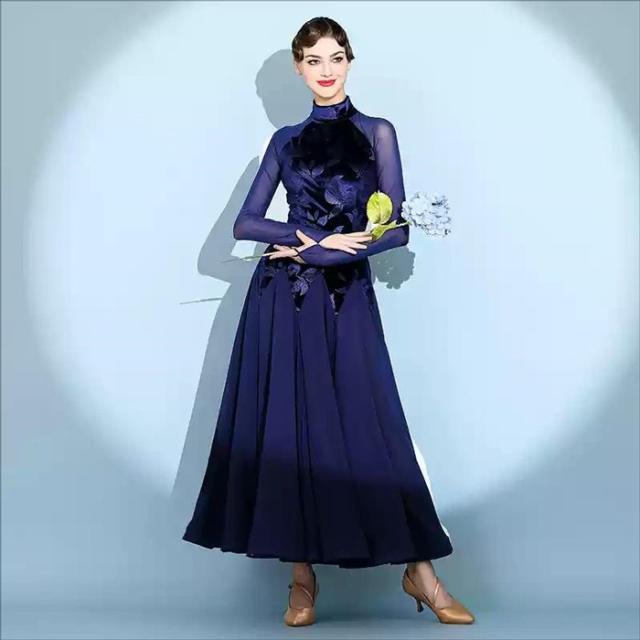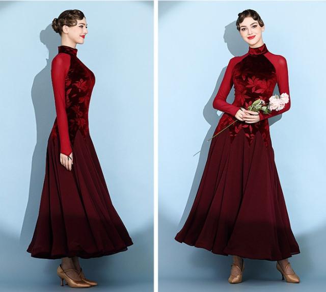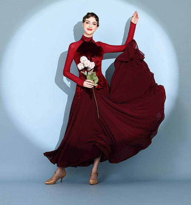 社交ダンス ドレス ロングドレス フリル 長袖 モダンドレス 社交ダンス衣装 モダン スタンダード ワルツ ワンピース ダンス衣装 ステージ衣装 パーティー 発表会 競技用 コンクール 練習着 レッスン 舞台用 演奏会 ワインレッド ネイビー be061x0x0jc
