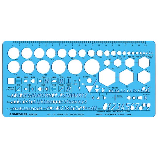 透明度が高いテンプレートのため図面も識別しやすいです。また、ブルーの本体色は目にもやさしく、長時間の作業にも適しています。 0.5mmシャープペンシル用、一部 0.7mmシャープペンシル用。 【仕様】Φ1-23mm 円、8-24mm 六角形、幾何公差記号(JIS B0021)、面の肌記号、字体 JIS / A形斜体 JIS(B001:2000)など。 日本製。