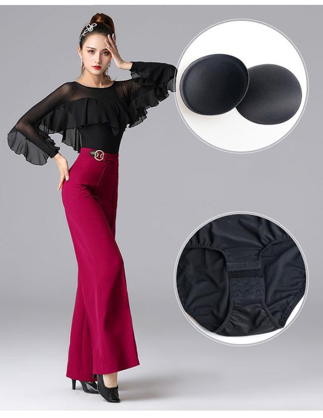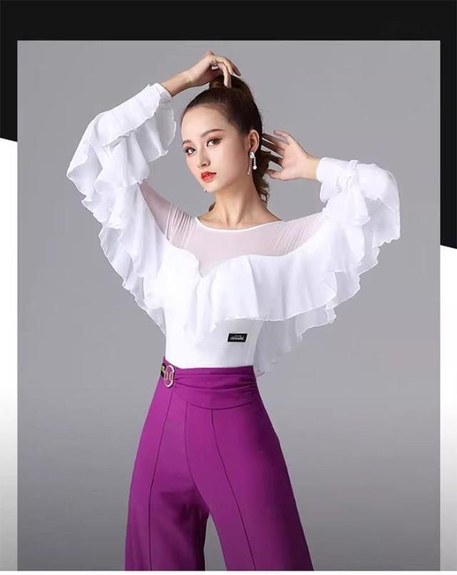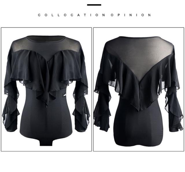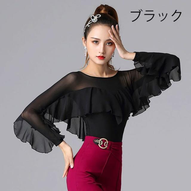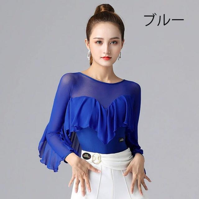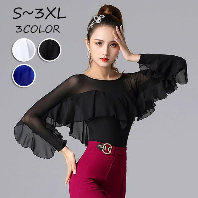社交ダンス トップス レオタード フレア袖 股下ホック 透け感 フリル 胸パッド付 ホワイト ブラック ブルー 長袖 ラテン モダン タンゴ サンバ ダンスウェア レディース 社交ダンス衣装 コンサート 舞台用 ステージ衣装 練習着 レッスンウェア dj001lclcjc