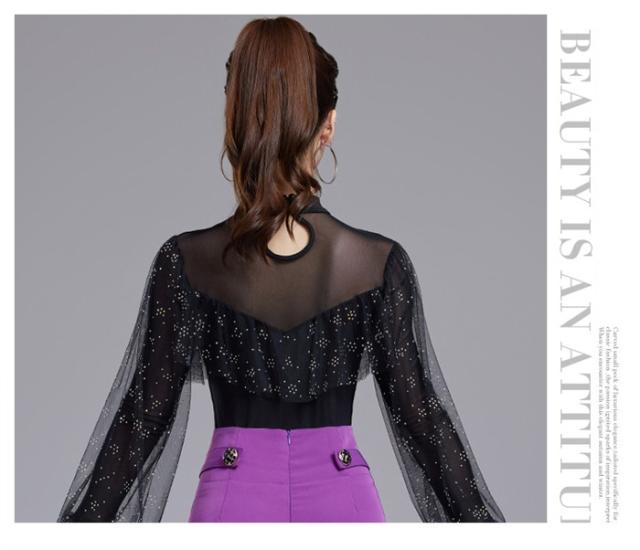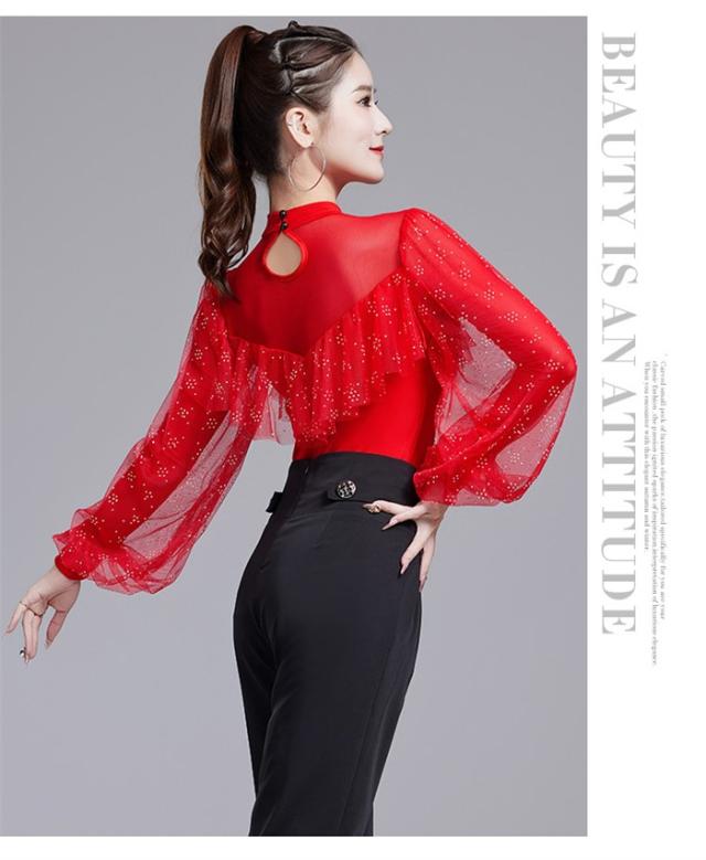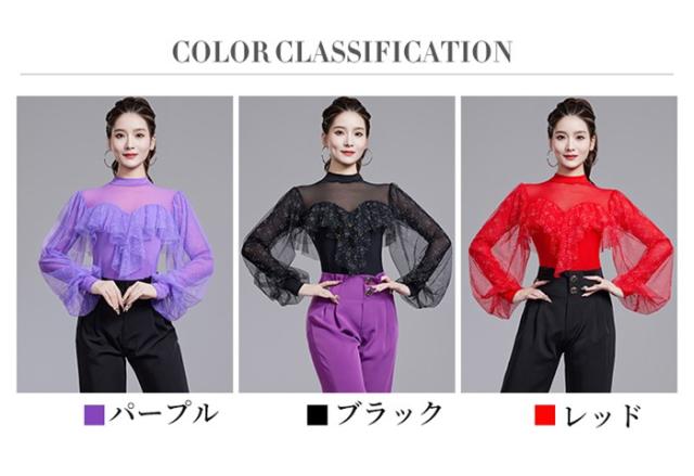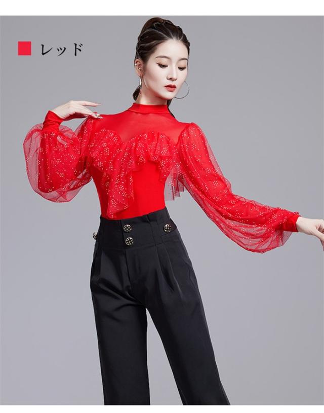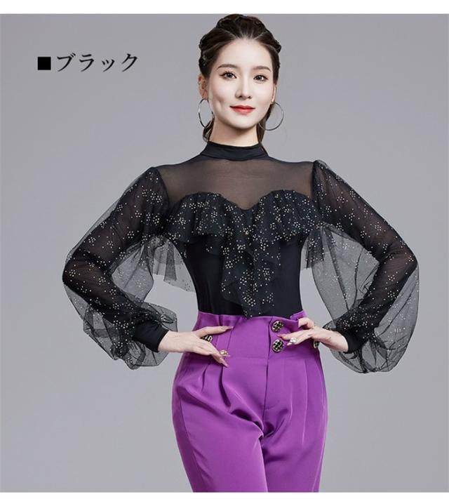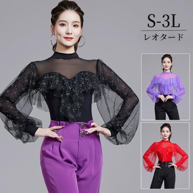 社交ダンス トップス レオタード 股下ホック 長袖 透け感 パープル 紫 ブラック 黒 レッド 赤 フリル 胸パッド付き ラテン モダン タンゴ サンバ ダンスウェア レディース 社交ダンス衣装 コンサート 舞台用 ステージ衣装 練習着 レッスンウェア