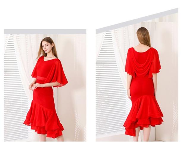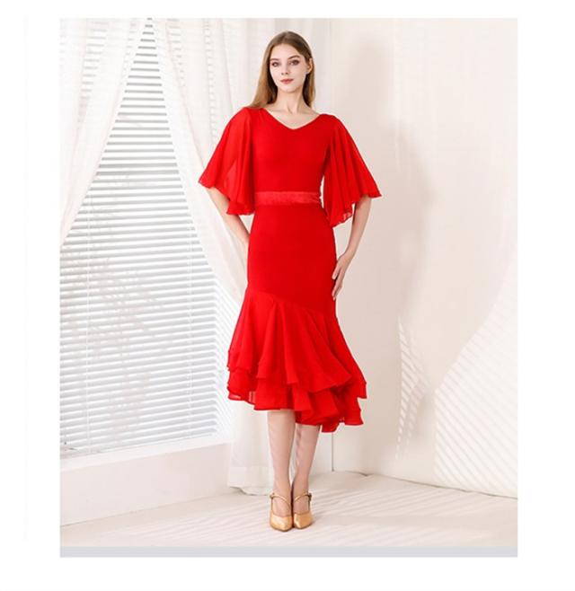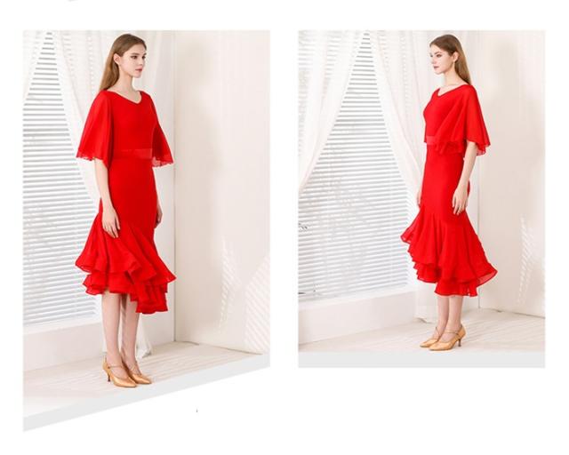社交ダンス ドレス フリル ミモレ丈 モダンドレス 赤 レッド 社交ダンス衣装 モダン スタンダード ワルツ ラテン チャチャチャ ルンバ サンバ ワンピース 無地 ダンス衣装 ステージ衣装 パーティー 発表会 競技用 コンクール 練習着 レッスン 舞台用 演奏会