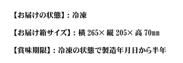 冷凍の状態で製造年月日から半年/解凍後はその日のうちにお召し上がりください。