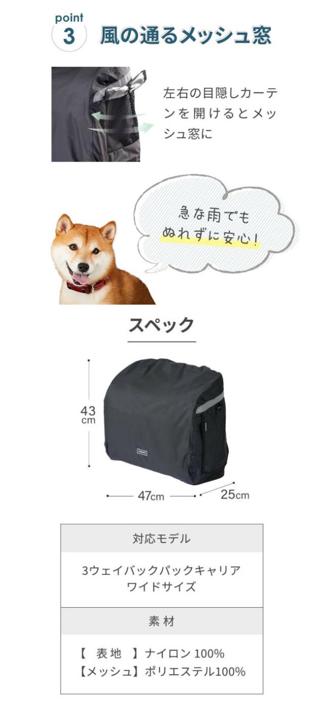 ・背負う・肩掛け・前抱きの3WAY仕様の、猫・小型犬用の移動用キャリー「3ウェイバックパック ワイドサイズ」専用のレインカバーです。