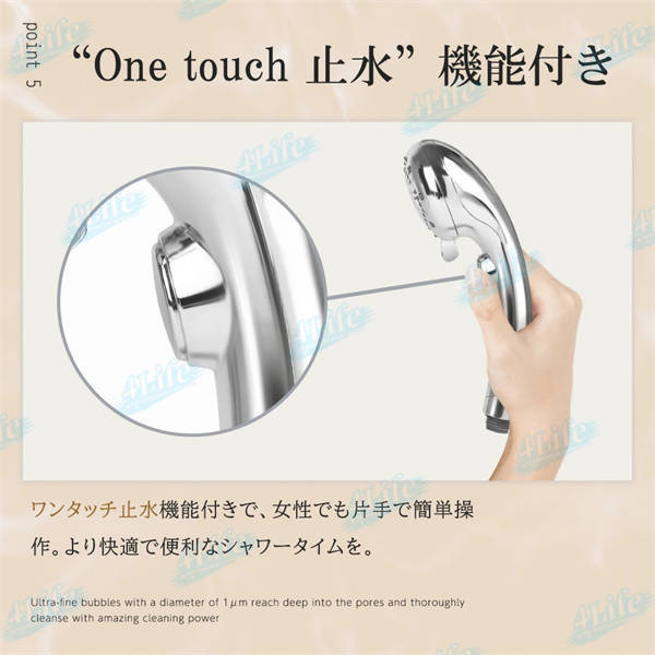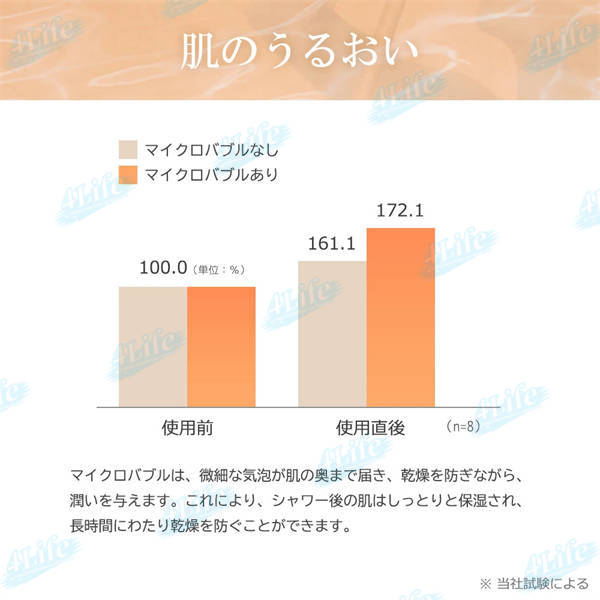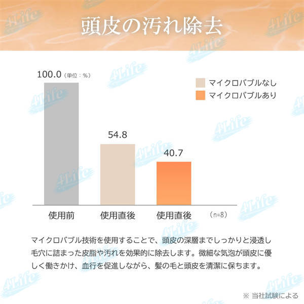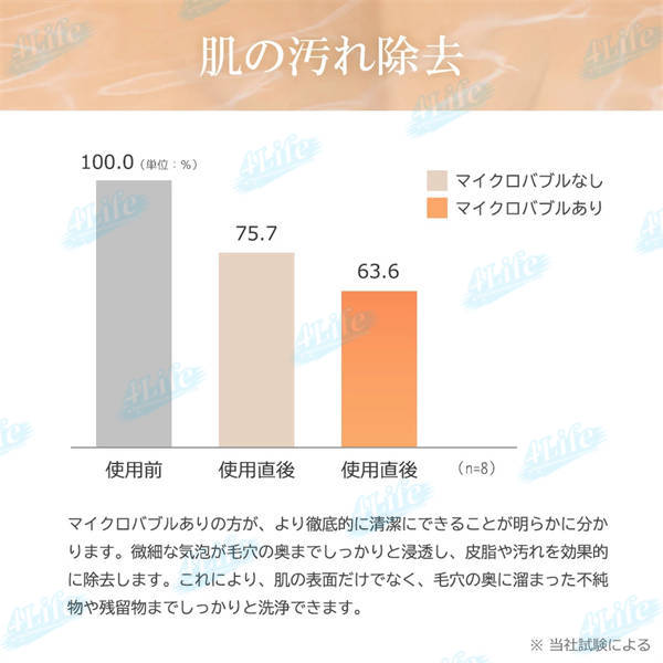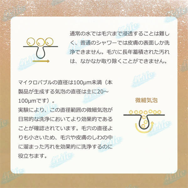 ??ウルトラファインバブルが水中に生成されており、ファンデーションによるキメ汚れや頭皮の汚れもスッキリ洗浄しますので、手が届きにくい背中汚れの洗い流しにぴったり。