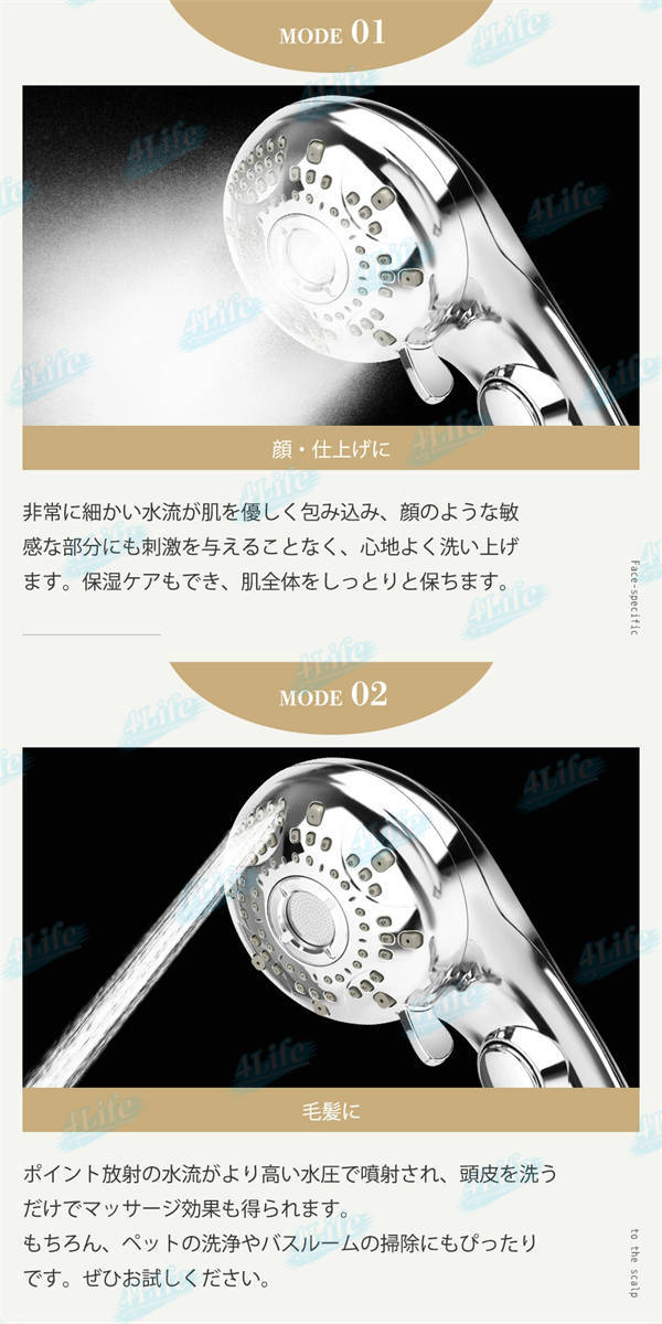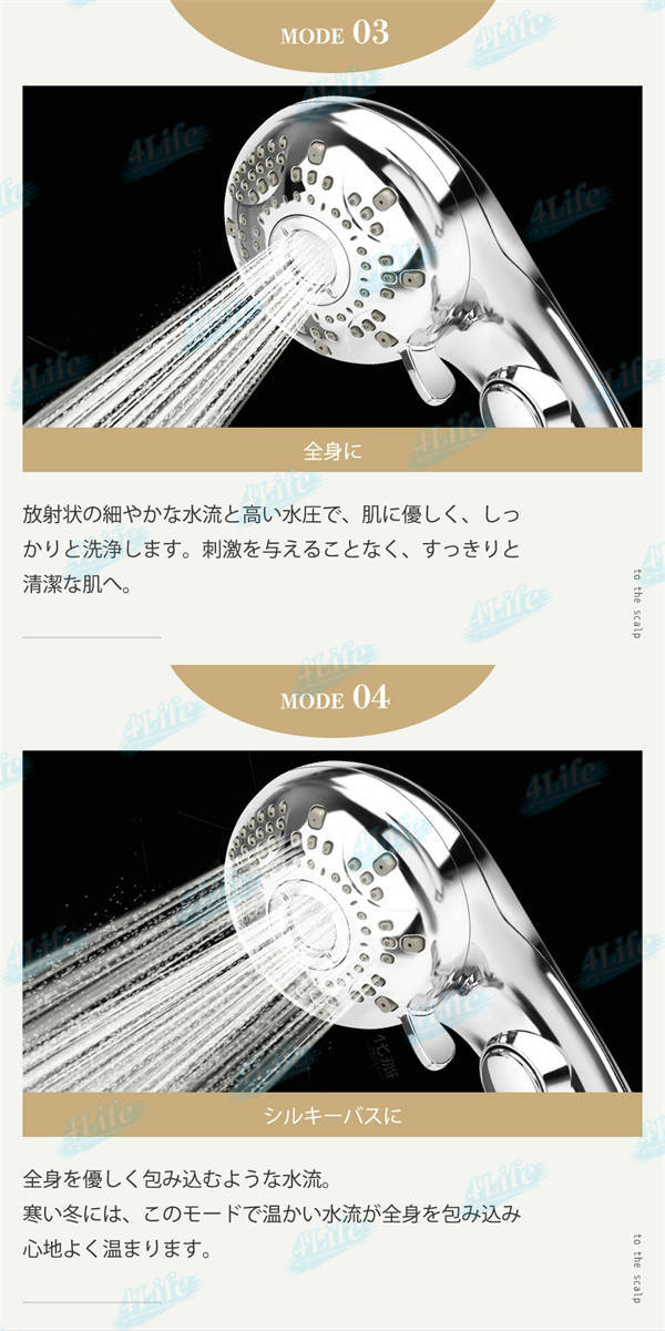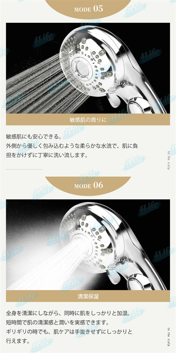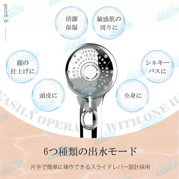 シャワーヘッド一つで全身をケア、浴びる部位や目的に合わせて選べる6つの水流モードで手元で簡単に切り替えできます。