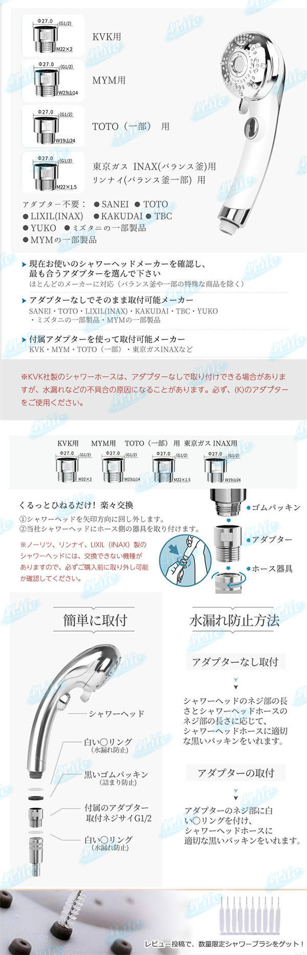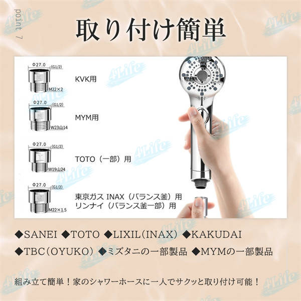 - 前のシャワーヘッドが18年前のだったので、取付けが出来るか心配でしたが とてもスムーズに出来ました 切替モードも使用中に親指で簡単にできるし、ストップボタンもあるので本当に使い勝手が良い商品でした