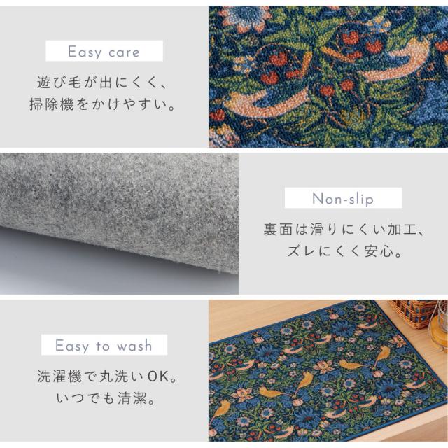 ウィリアム・モリスの代表作「いちご泥棒」の大判の玄関マット。植物、鳥やイチゴの繊細で美しい絵柄が、インテリアに彩りを加えます。ループパイル仕様で遊び毛が出にくいカーペット調。掃除機をかけやすいのでお手入れ楽ちん。