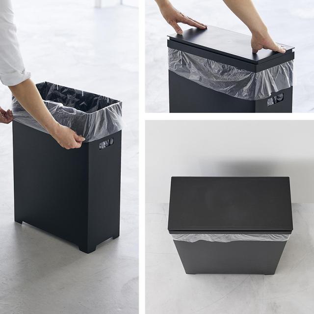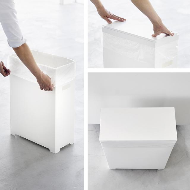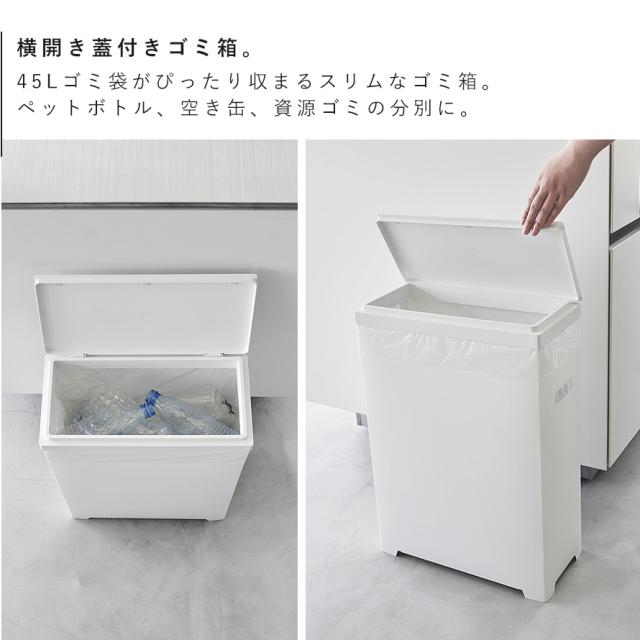 組み立て簡単!45Lゴミ袋がぴったり収まるスリムな横開き蓋付きゴミ箱。蓋が横に開くのでパントリーや食器棚下スペースにも収納可能。