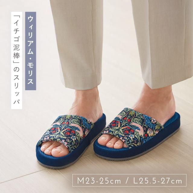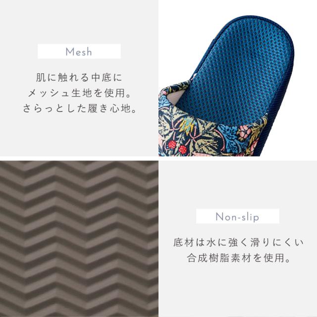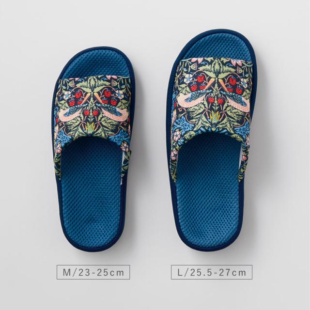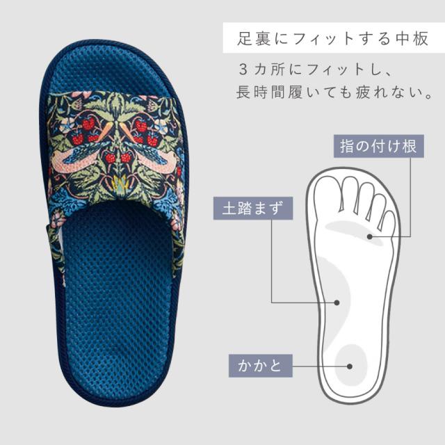 ウィリアム・モリスの代表作「いちご泥棒」のスリッパ。植物、鳥やイチゴの繊細で美しい絵柄が、インテリアに彩りを加えます。足裏に合わせた中板形状のため、中ですき間ができにくく心地よくフィット。肌に触れる中底にメッシュ生地を使用し、さらっとした履き心地です。