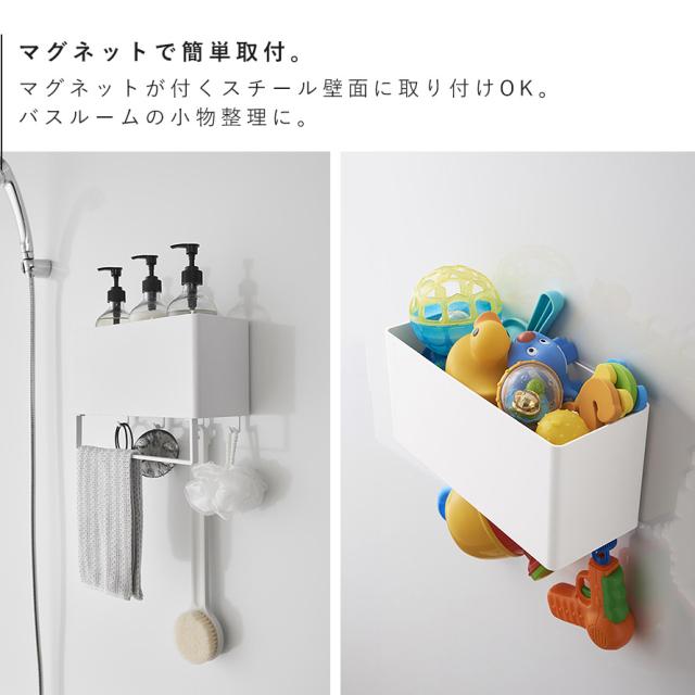 お好みの場所にマグネットで簡単取り付け。ホースを掛けられるフック付きバスケット。