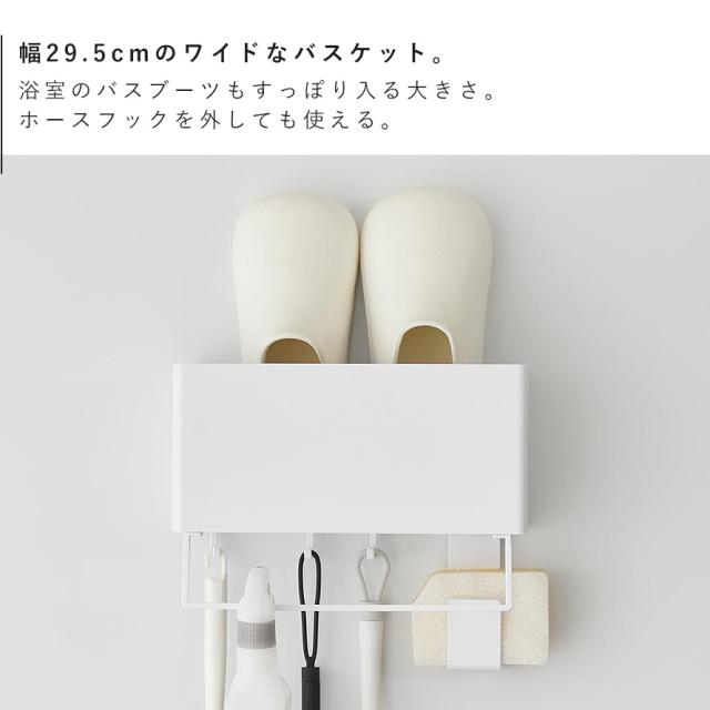 ワイドサイズのバスケットにはバスブーツも入り、フック部分にはスポンジも収納できるので掃除道具をまとめて収納可能。