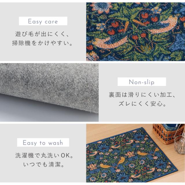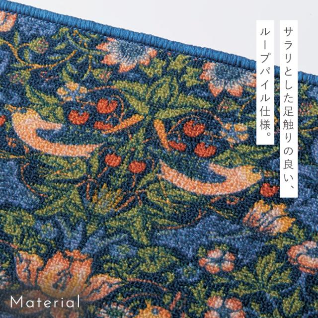 ウィリアム・モリスの代表作「いちご泥棒」の玄関マット。植物、鳥やイチゴの繊細で美しい絵柄が、インテリアに彩りを加えます。ループパイル仕様で遊び毛が出にくいカーペット調。掃除機をかけやすいのでお手入れ楽ちん。