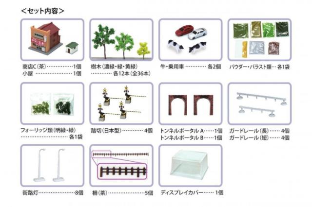 | セット内容 | ・ディスプレイカバー×1個 ・商店C(茶)×1個 ・小屋×1個 ・パウダー類×各1袋 ・乗用車×2個 ・牛×2個 ・樹木(濃緑)×8本 ・樹木(緑)×12本 ・樹木(黄緑)×6本 ・フォーリッジ類(濃緑、緑)×各1袋 ・バラスト(灰色)×1袋 ・トンネルポータル(A、B)×各1個 ・ガードレール(長)×4個 ・ガードレール(短)×4個 ・街路灯×8個 ・柵(茶)×2個 ・踏切(日本型)×4個 ・取扱説明書×1 ※車両(列車)は別売り |