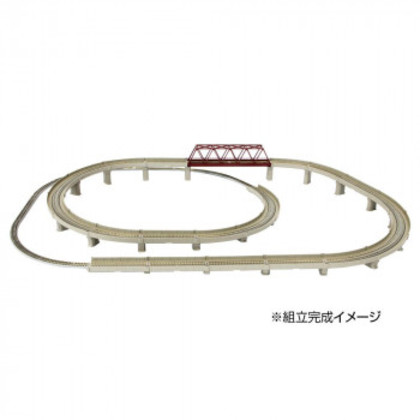 | セット内容 | 直線レール25mm×2、55mm×1、110mm×2 曲線レールR195-30度×8単線 トラス鉄橋(レール付き)×1 高架橋付きレール110mm×7、R195-30度×16橋脚、水平×3、勾配×20、リレーラー×1 |