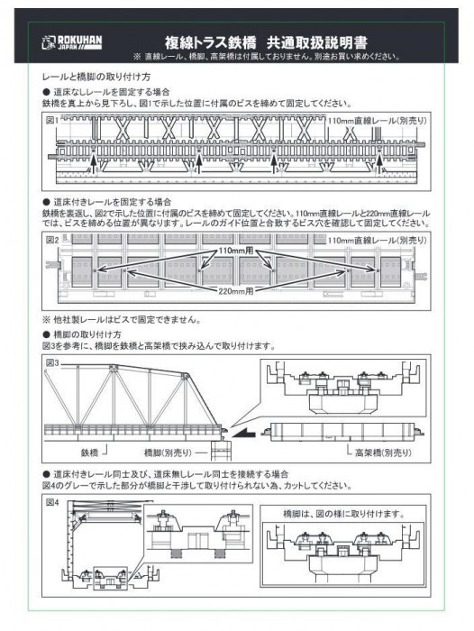商品詳細:レールは別売りのR045(道床無し110mm レール)のご使用をお勧めいたします。 生産国:中国 素材・材質:ABS、洋白、ステンレス 商品サイズ:W6.5cm×D22cm×H5.5cm×1本 仕様:対象年齢:15歳以上 セット内容:複線トラス鉄橋 (茶)220mm×1本