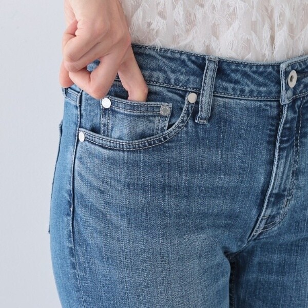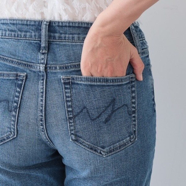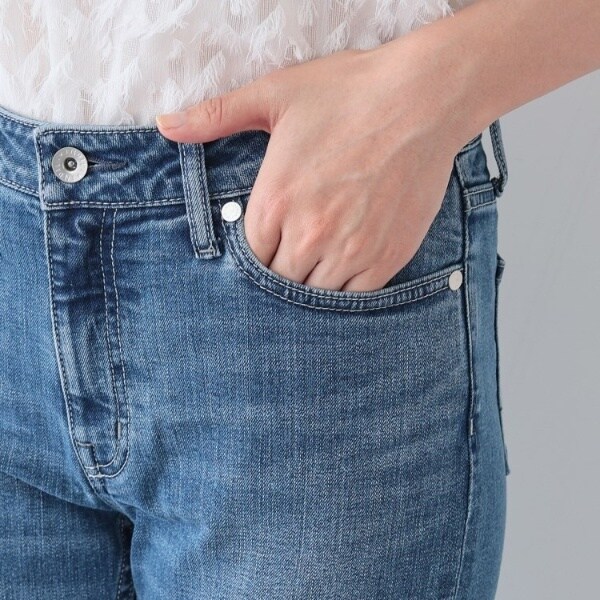 ヒップ位置は高く、立体的に丸みを出すようこだわったパターンで後ろ姿にも抜かりないINDIVIならではのレディライクデニムです。