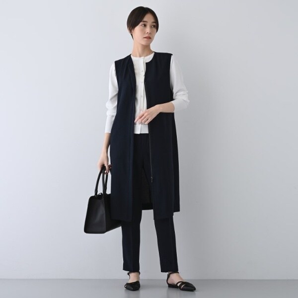 同素材のVネックブラウスと合わせたセットアップもこなれた通勤スタイルになります。