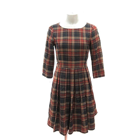 【中古】クイーンズコート ワンピース ひざ丈 ウール チェック ウエストマーク 長袖 1 S 赤 レッド 茶 レディース