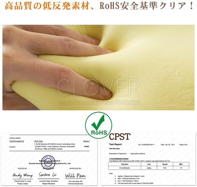 RoHS検査を実施し、厳しい欧州基準をクリアした低反発座布団。厳選されたウレタンを採用し、座り心地抜群。