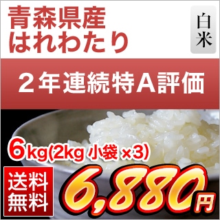 青森県産 はれわたり 白米 <2回連続特A評価> 6kg(2kg×3袋) 【送料無料】【米袋は窒素充填包装】【即日出荷】令和7年(2025年)産