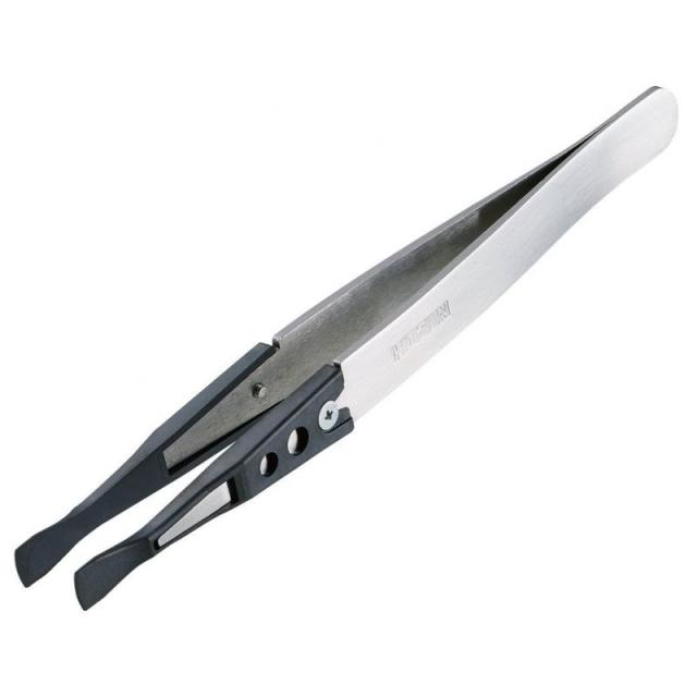 【チップ交換式×ヘラ型ワイド先端で幅広い作業にマルチ対応】P-645-Sは、用途に合わせて先端チップを交換できる“チップ交換式ESDピンセット”シリーズのハイユーティリティモデルです。さまざまな先端形状がラインナップされているため、電子部品の組立からクラフト作業までこれ1本で幅広く対応可能。本モデルは6.0mmのヘラ型ワイド先端を採用し、薄い物や柔らかい素材を面でしっかり支えることができる点が最大の魅力です。点でつまむのではなく面で押さえる構造により、紙・フィルム・シール・デカール・布・柔らかいパーツなども破れ・キズ・変形を防ぎながら確実に保持でき、精密作業をよりストレスなく行えます。