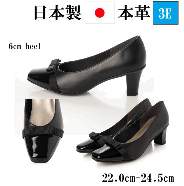 日本製 本革 牛革 レザーパンプス 柔らかレザー 幅広 3e 外反母趾 リボン コンフォートパンプス 低反発インソール 歩きやすい 履きやすい 疲れにくい シンプル おしゃれ 上品 通勤 会社用 冠婚葬祭 リクルート ブラック